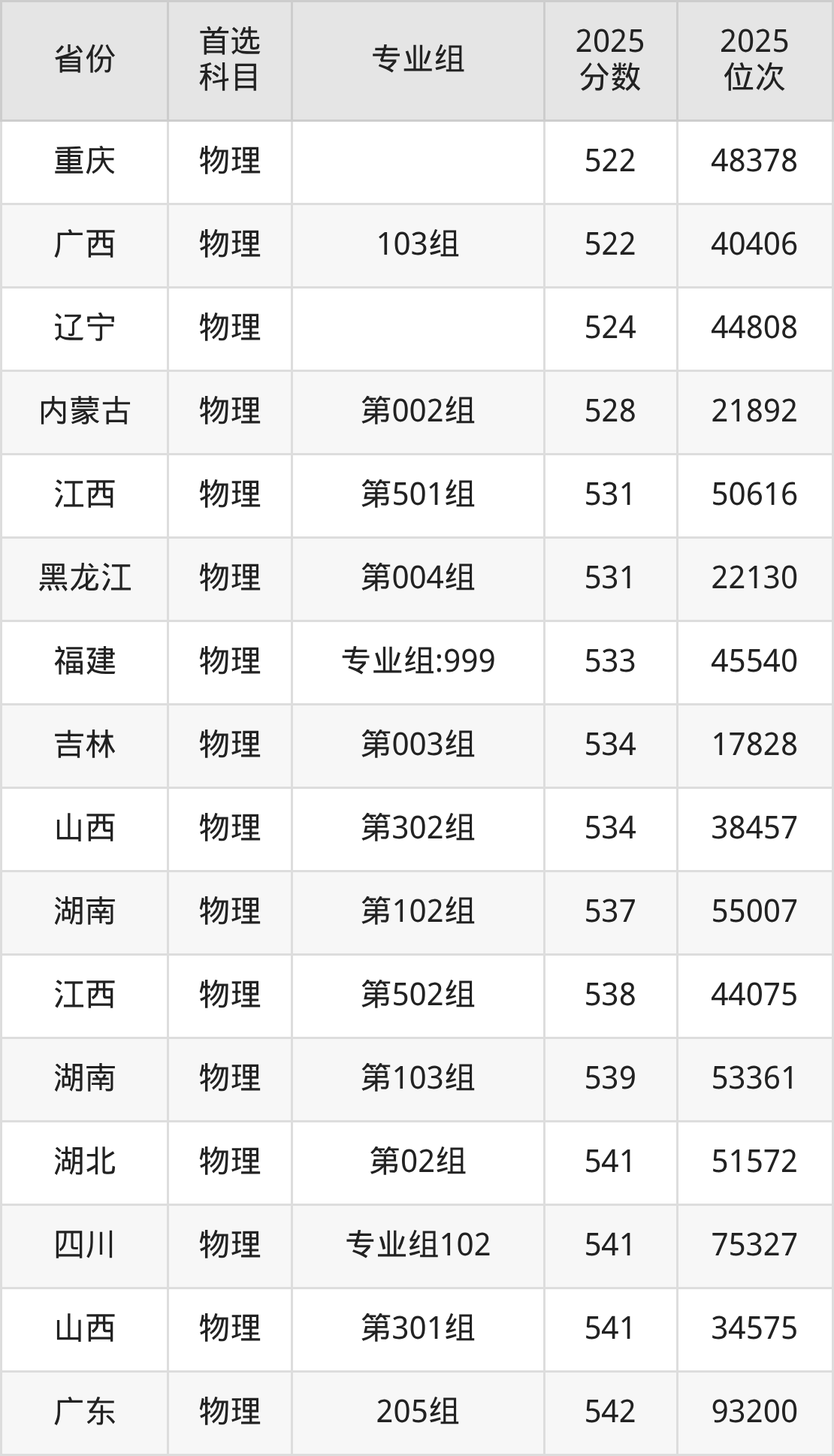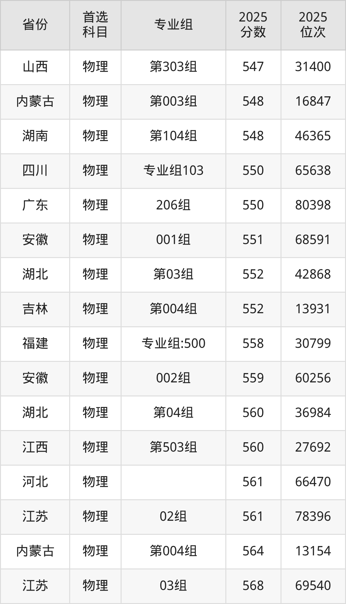 物理类最低分对应地区为宁夏(002专业组),录取位次为15352,超本科B73分;最高分对应地区为安徽(003组),录取位次为48124,超本科线111分。
