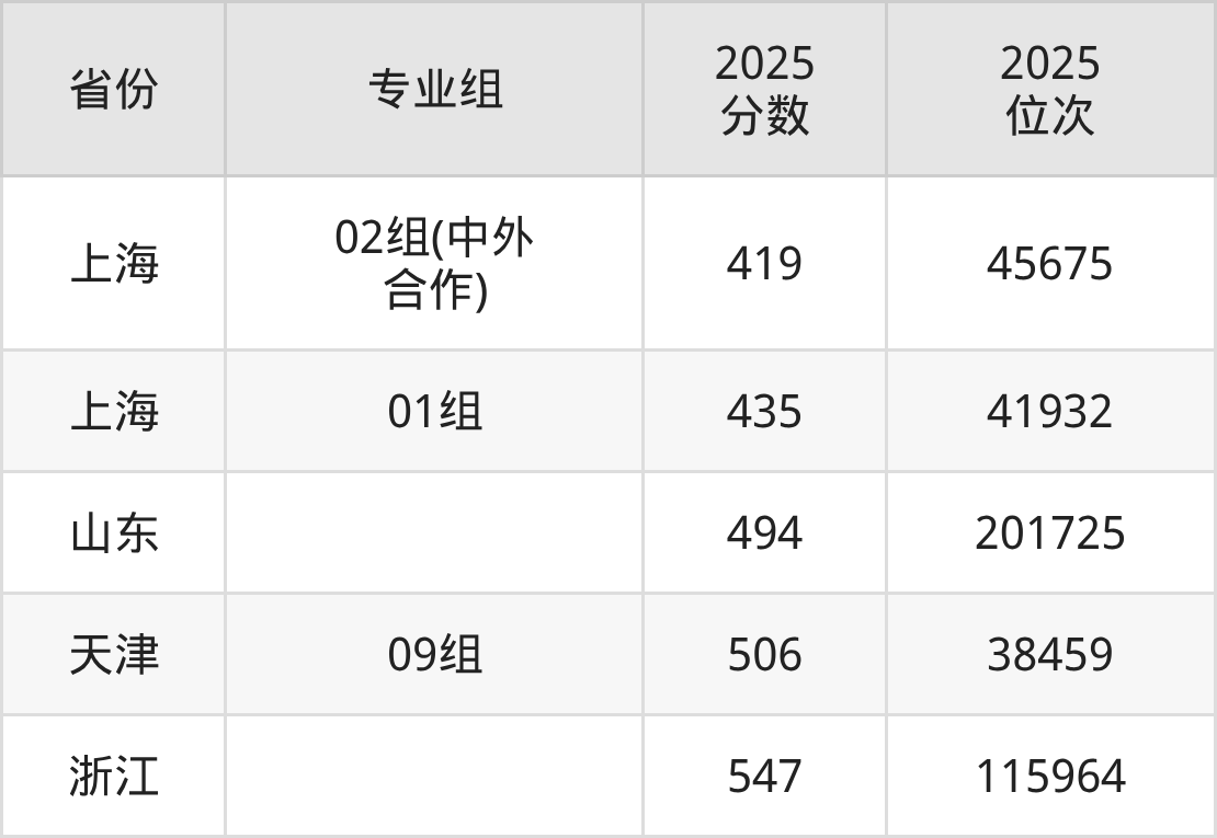 最低分对应地区为上海(02组(中外合作)),录取位次为45675,超本科线17分;最高分对应地区为浙江,录取位次为115964,超一段线57分。