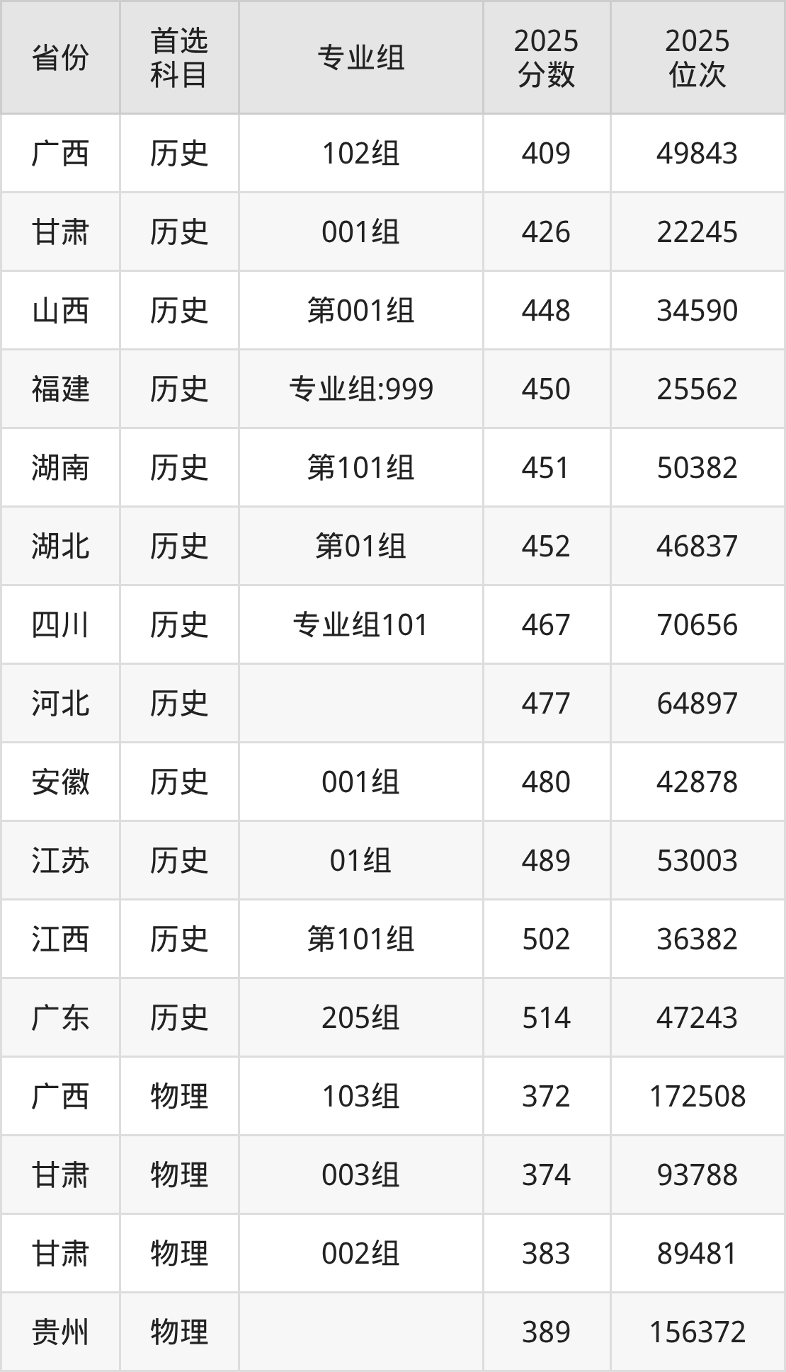 历史类最低分对应地区为广西(102组),录取位次为49843,超本科线7分;最高分对应地区为广东(205组),录取位次为47243。