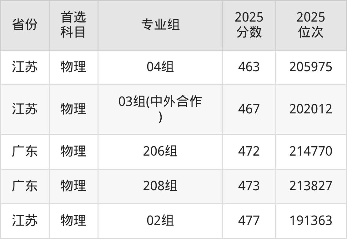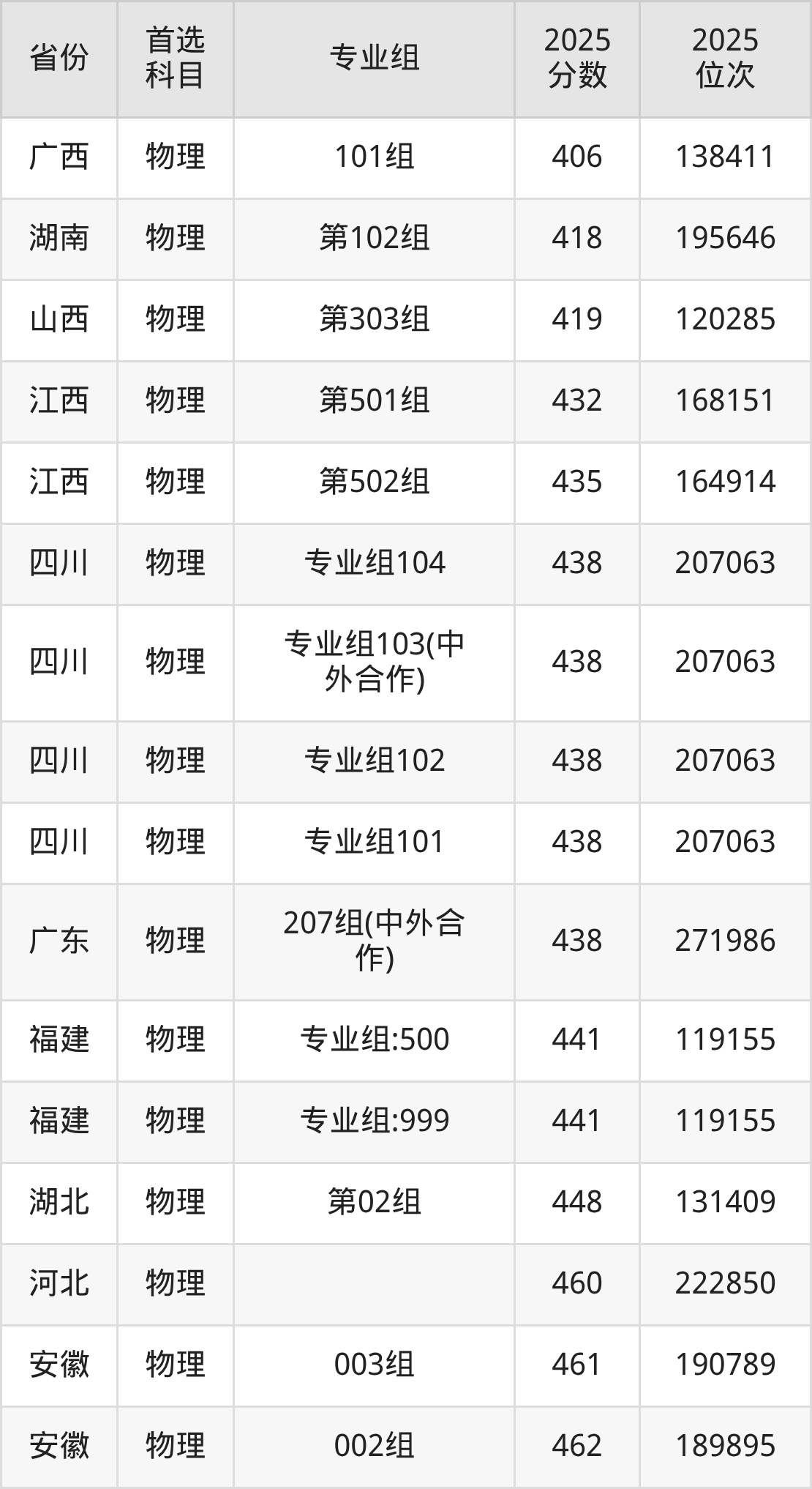物理类最低分对应地区为广西(103组),录取位次为172508,超本科线2分;最高分对应地区为江苏(02组),录取位次为191363,超本科线14分。