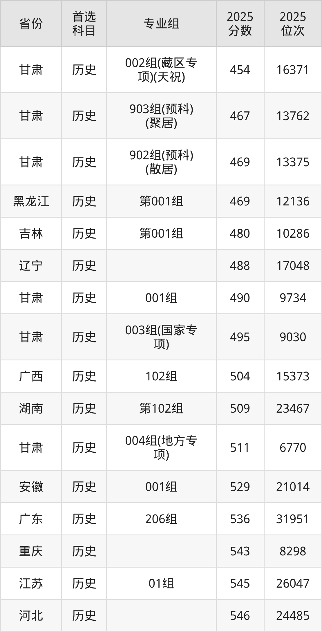 历史类:001组490分、9734名,002组(藏区专项)(天祝)454分、16371名,003组(国家专项)495分、9030名,004组(地方专项)511分、6770名,902组(预科)(散居)469分、13375名,903组(预科)(聚居)467分、13762名;