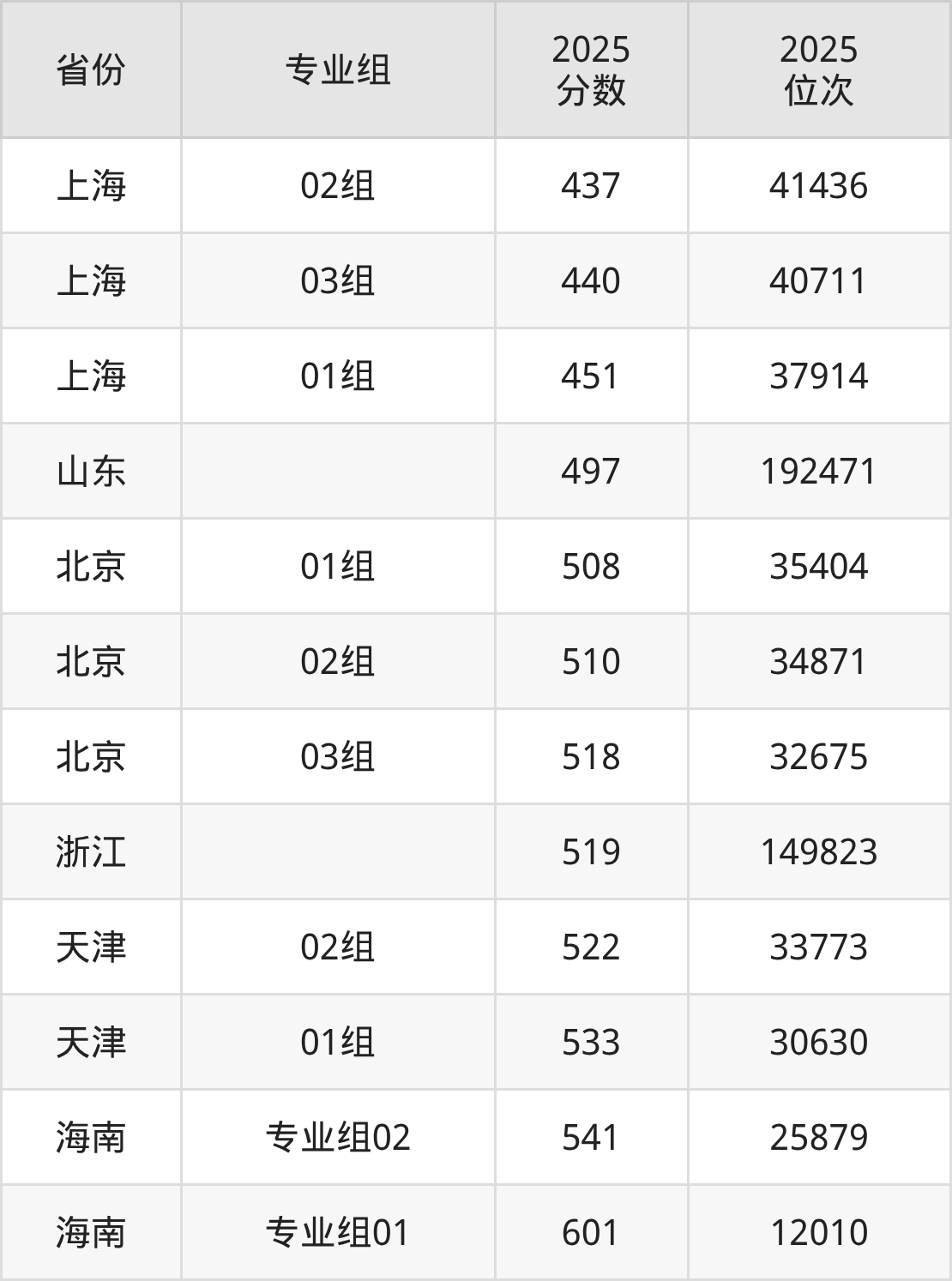 最低分对应地区为上海(02组),录取位次为41436,超本科线35分;最高分对应地区为海南(专业组01),录取位次为12010,超本科线121分。