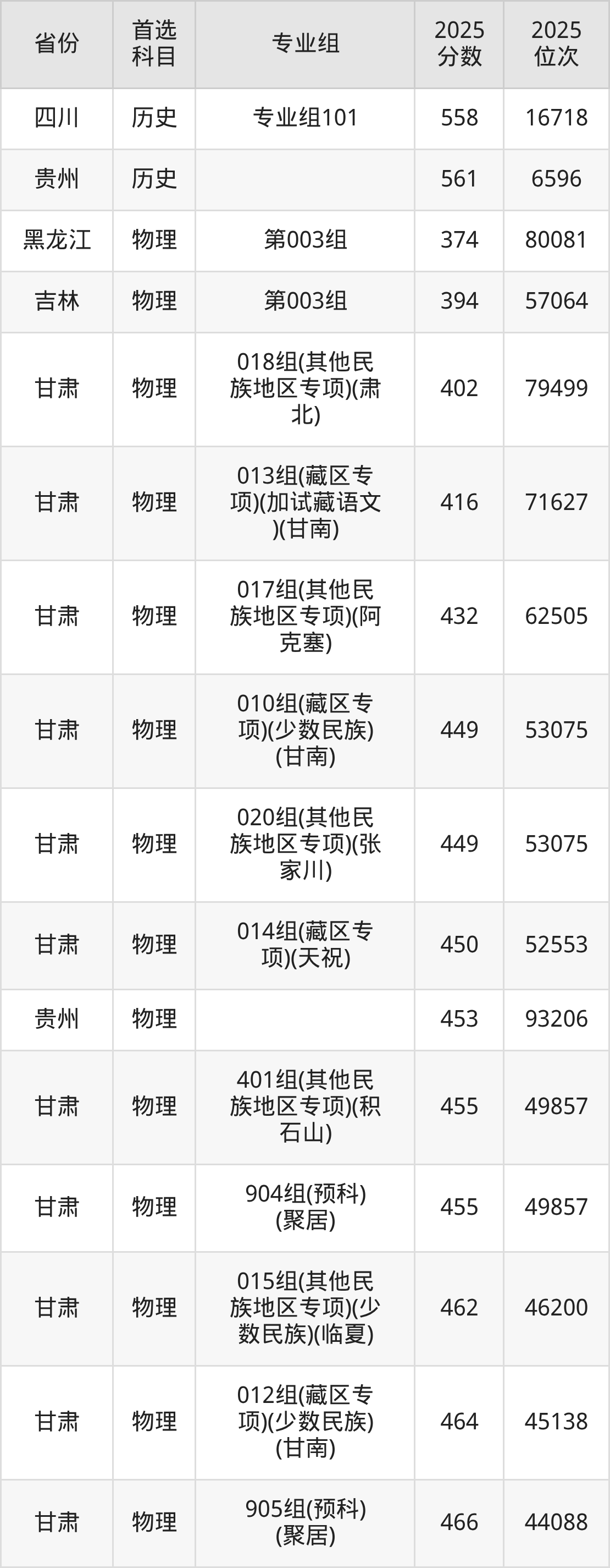 历史类最低分对应地区为甘肃(002组(藏区专项)(天祝)),录取位次为16371,超本科线42分;最高分对应地区为贵州,录取位次为6596,超本科线103分。