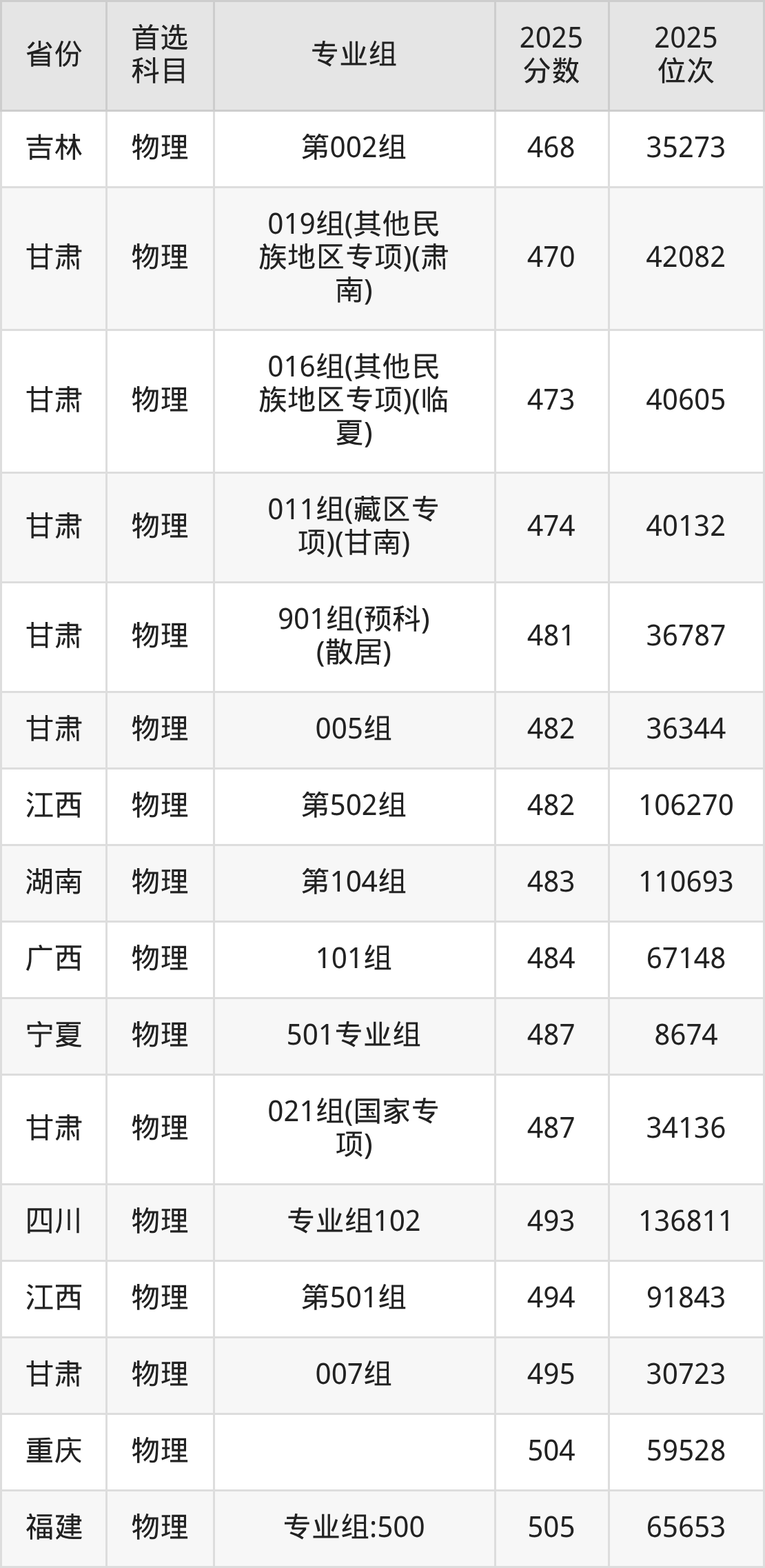 物理类:005组482分、36344名,006组512分、23940名,007组495分、30723名,008组529分、18086名,009组523分、20042名,010组(藏区专项)(少数民族)(甘南)449分、53075名,011组(藏区专项)(甘南)474分、40132名,012组(藏区专项)(少数民族)(甘南)464分、45138名,013组(藏区专项)(加试藏语文)(甘南)416分、71627名,014组(藏区专项)(天祝)450分、52553名,015组(其他民族地区专项)(少数民族)(临夏)462分、46200名,016组(其他民族地区专项)(临夏)473分、40605名,017组(其他民族地区专项)(阿克塞)432分、62505名,018组(其他民族地区专项)(肃北)402分、79499名,019组(其他民族地区专项)(肃南)470分、42082名,020组(其他民族地区专项)(张家川)449分、53075名,021组(国家专项)487分、34136名,022组(地方专项)508分、25459名,401组(其他民族地区专项)(积石山)455分、49857名,901组(预科)(散居)481分、36787名,904组(预科)(聚居)455分、49857名,905组(预科)(聚居)466分、44088名;