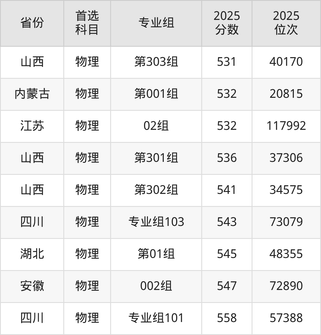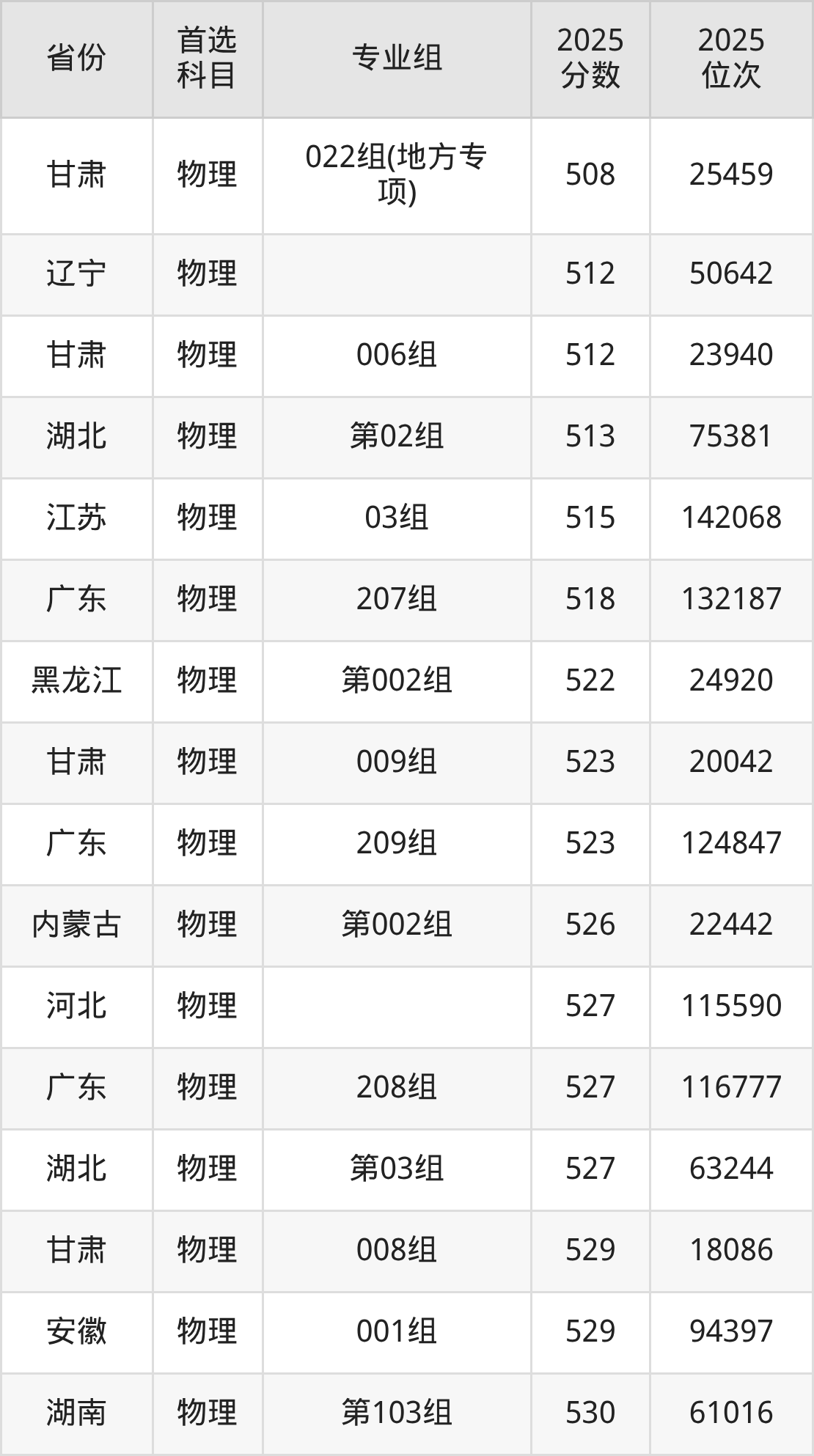 物理类最低分对应地区为黑龙江(第003组),录取位次为80081,超本科线14分;最高分对应地区为四川(专业组101),录取位次为57388。
