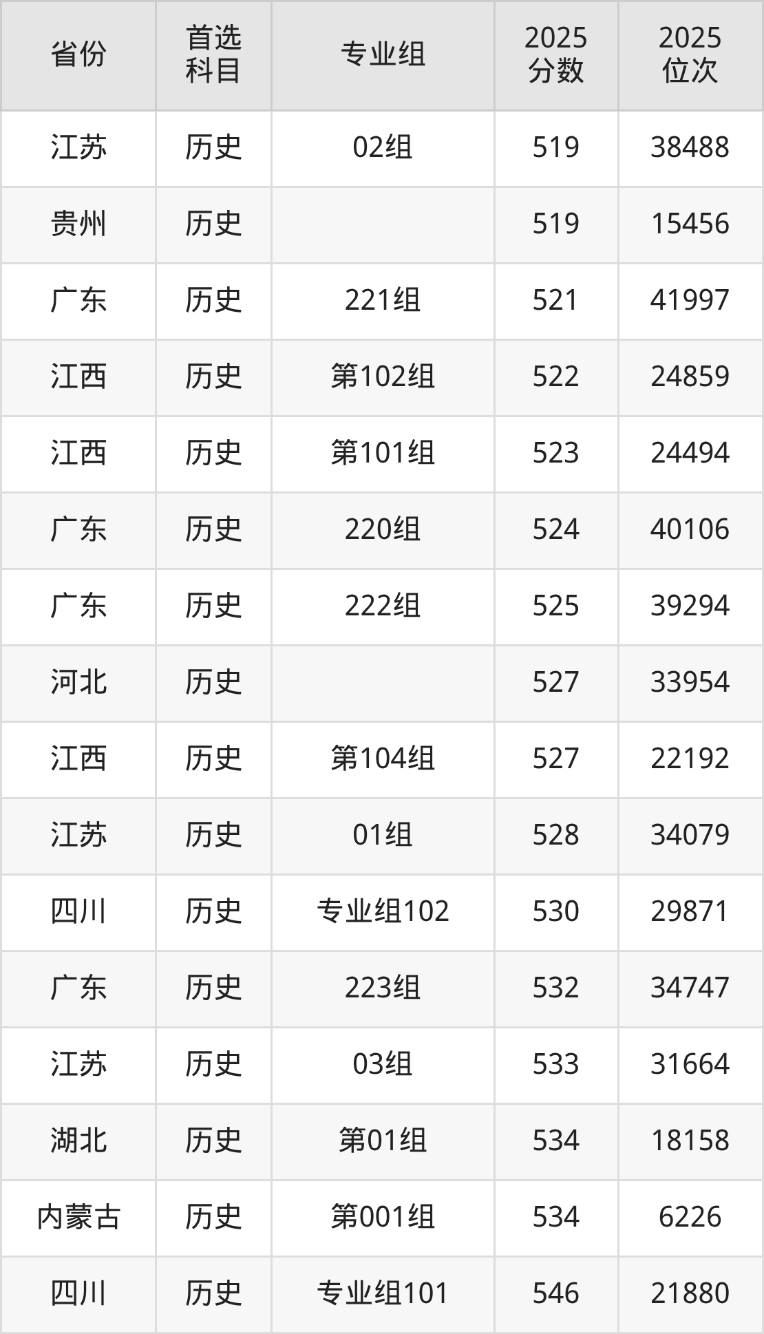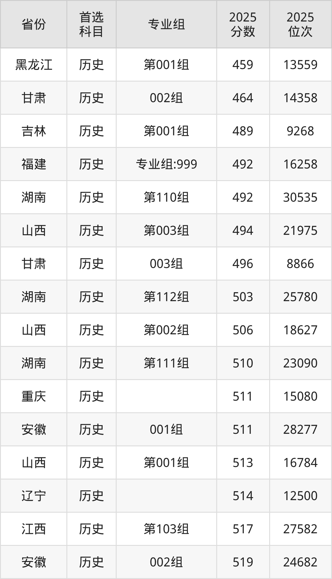 历史类最低分对应地区为黑龙江(第001组),录取位次为13559,超本科线54分;最高分对应地区为四川(专业组101),录取位次为21880,超本科B79分。