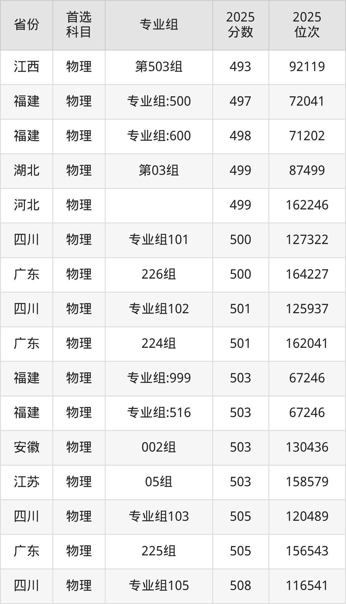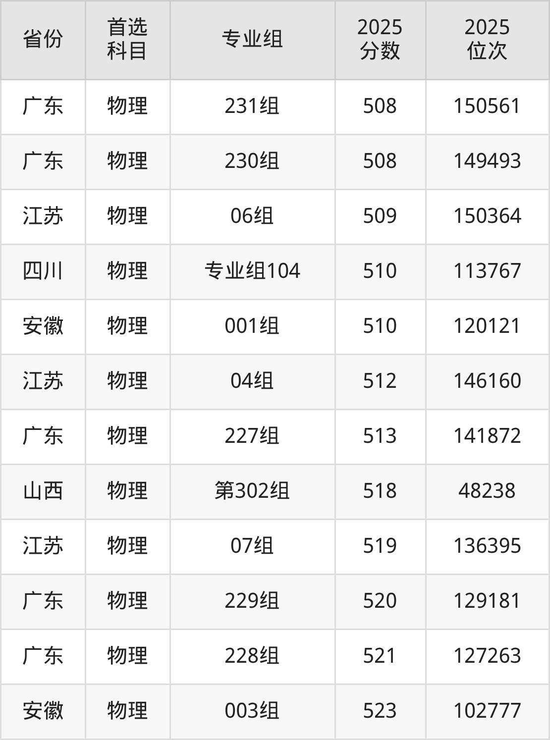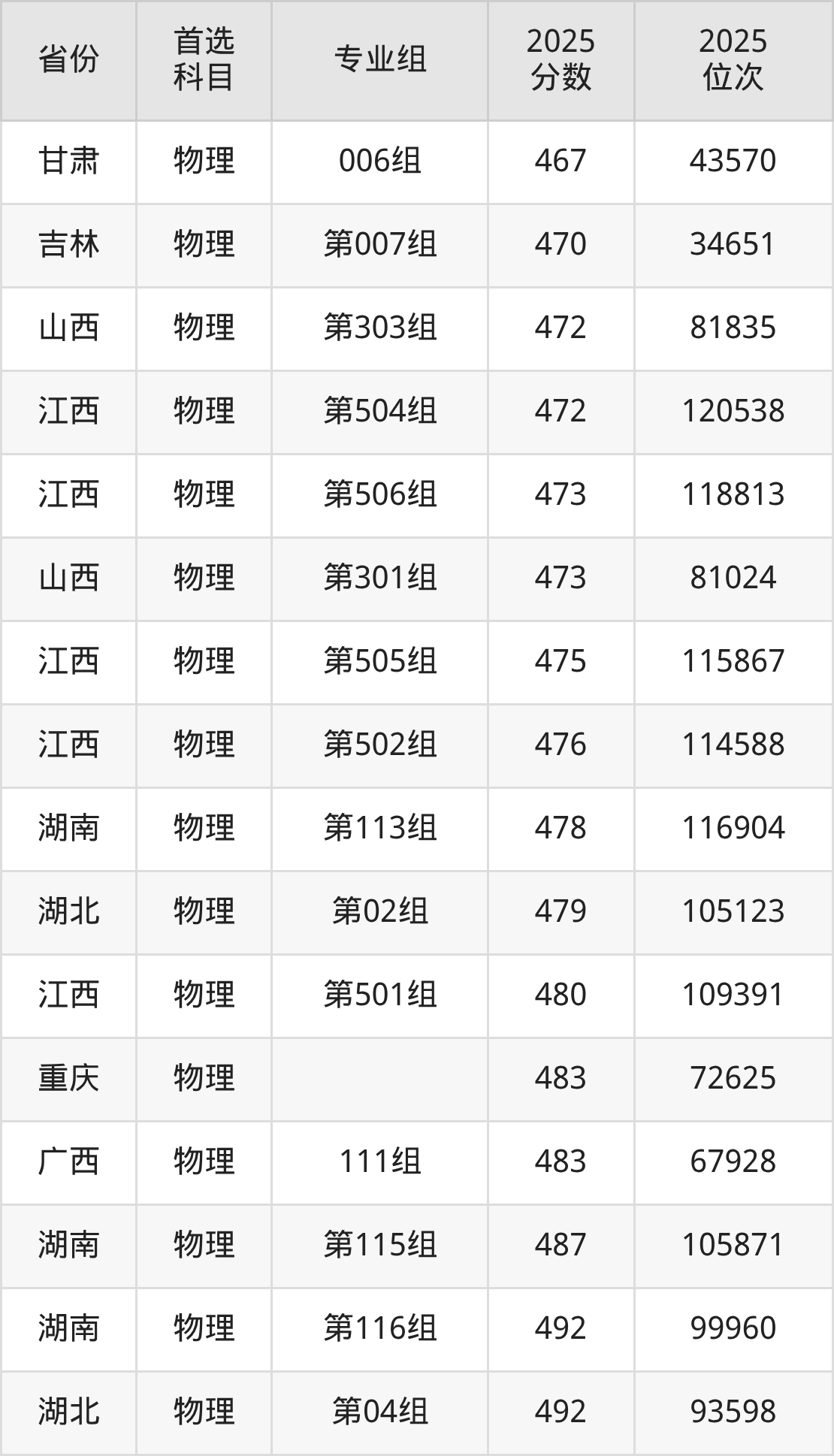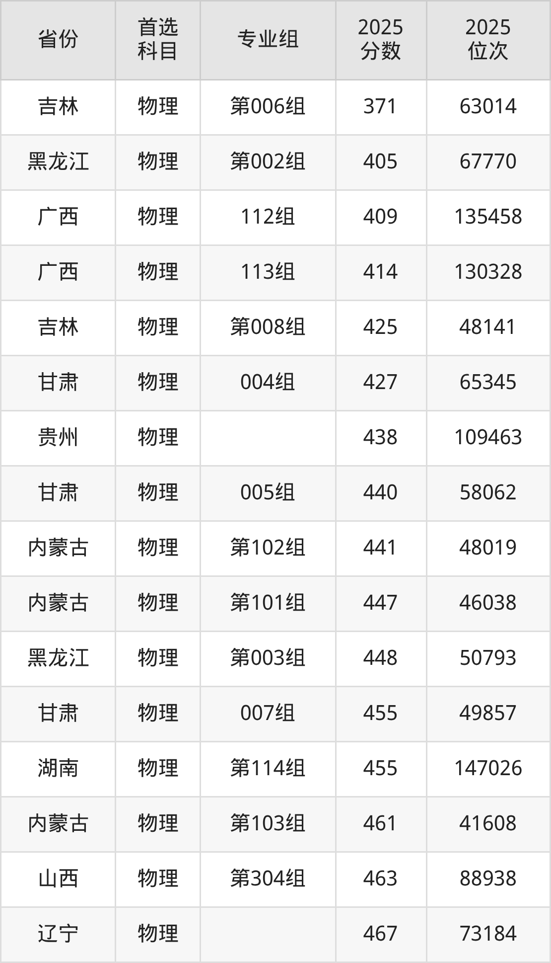 物理类最低分对应地区为吉林(第006组),录取位次为63014,超本科线31分;最高分对应地区为安徽(003组),录取位次为102777,超本科线62分。