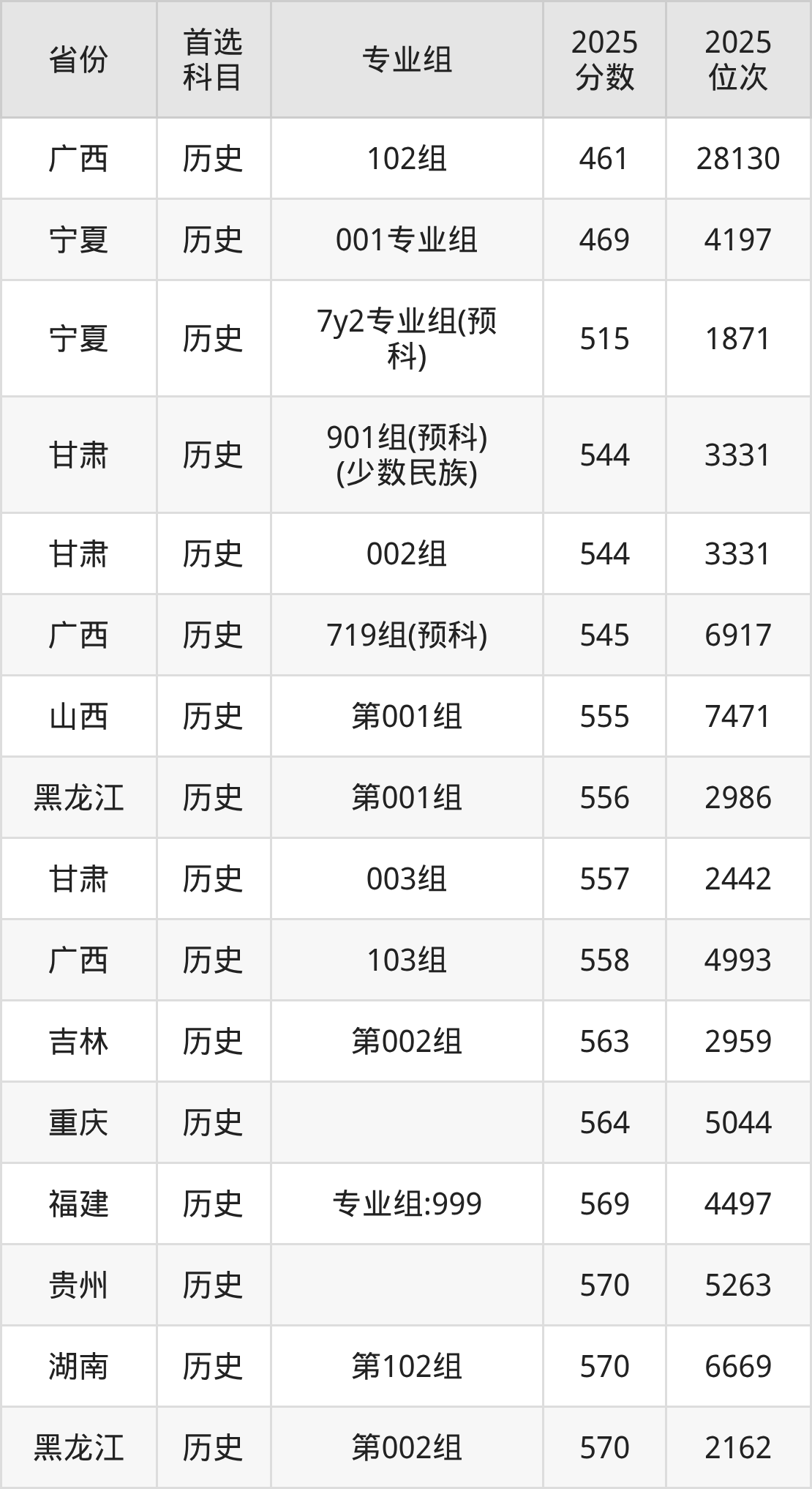 历史类:第001组556分、2986名,第002组570分、2162名;