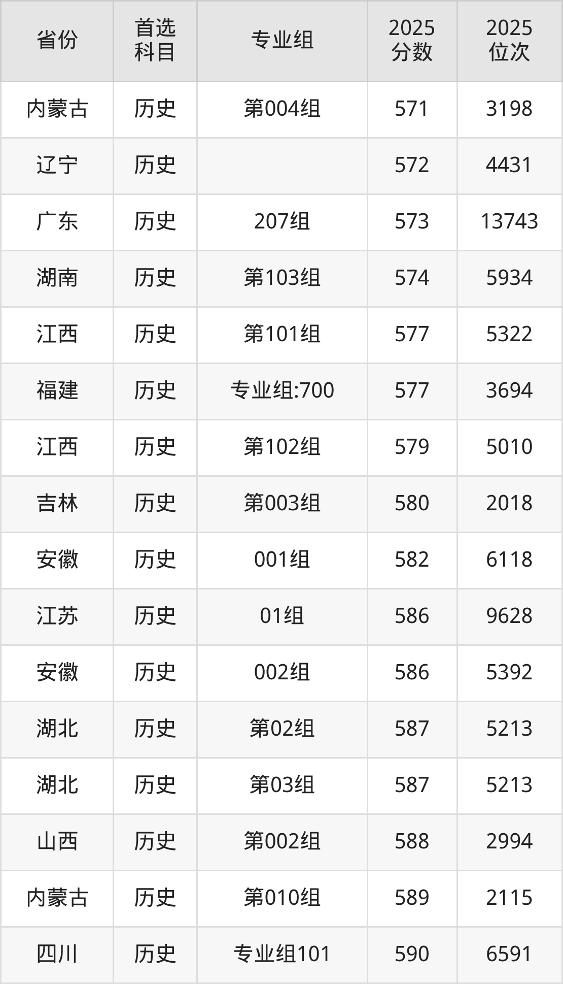 历史类:第001组565分、2981名,第002组585分、1858名;