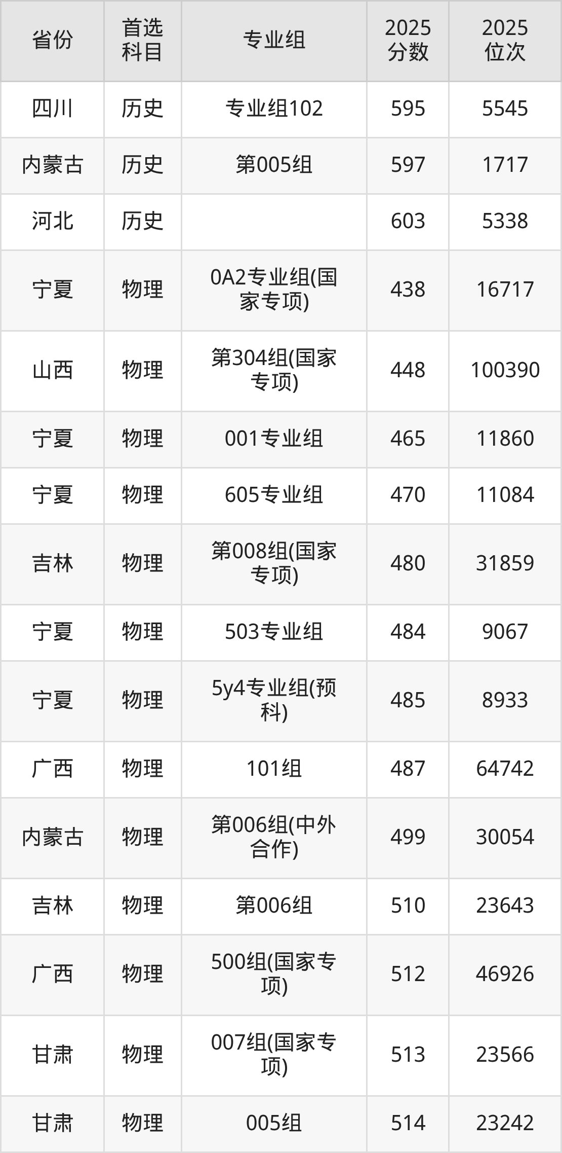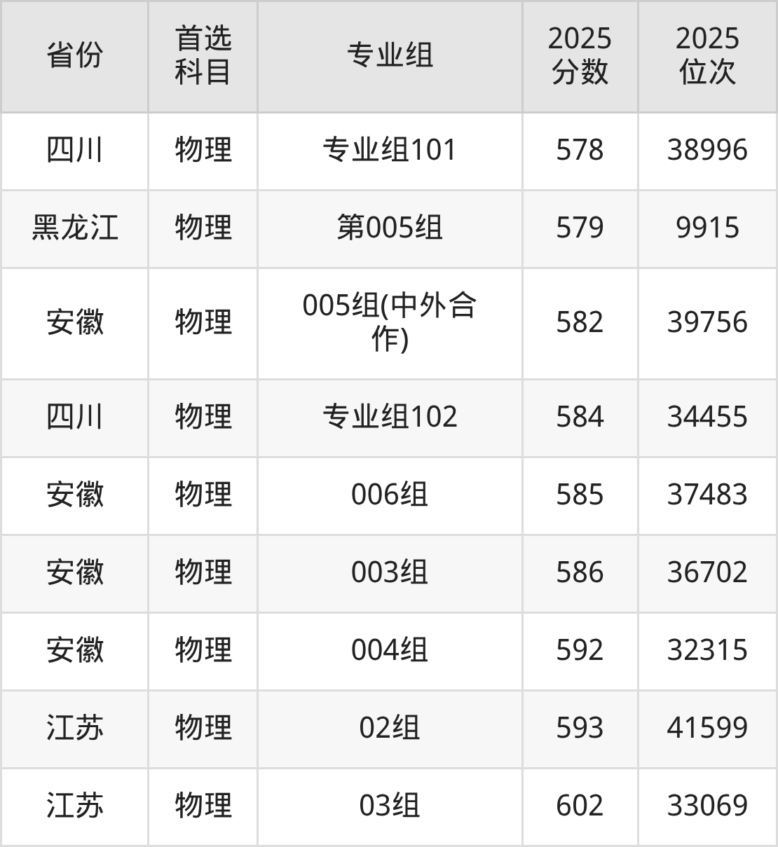 物理类:第003组(国家专项)580分、12704名,第005组563分、16561名,第006组568分、15371名,第007组(中外合作)523分、27469名,第008组(预科班)579分、12906名;