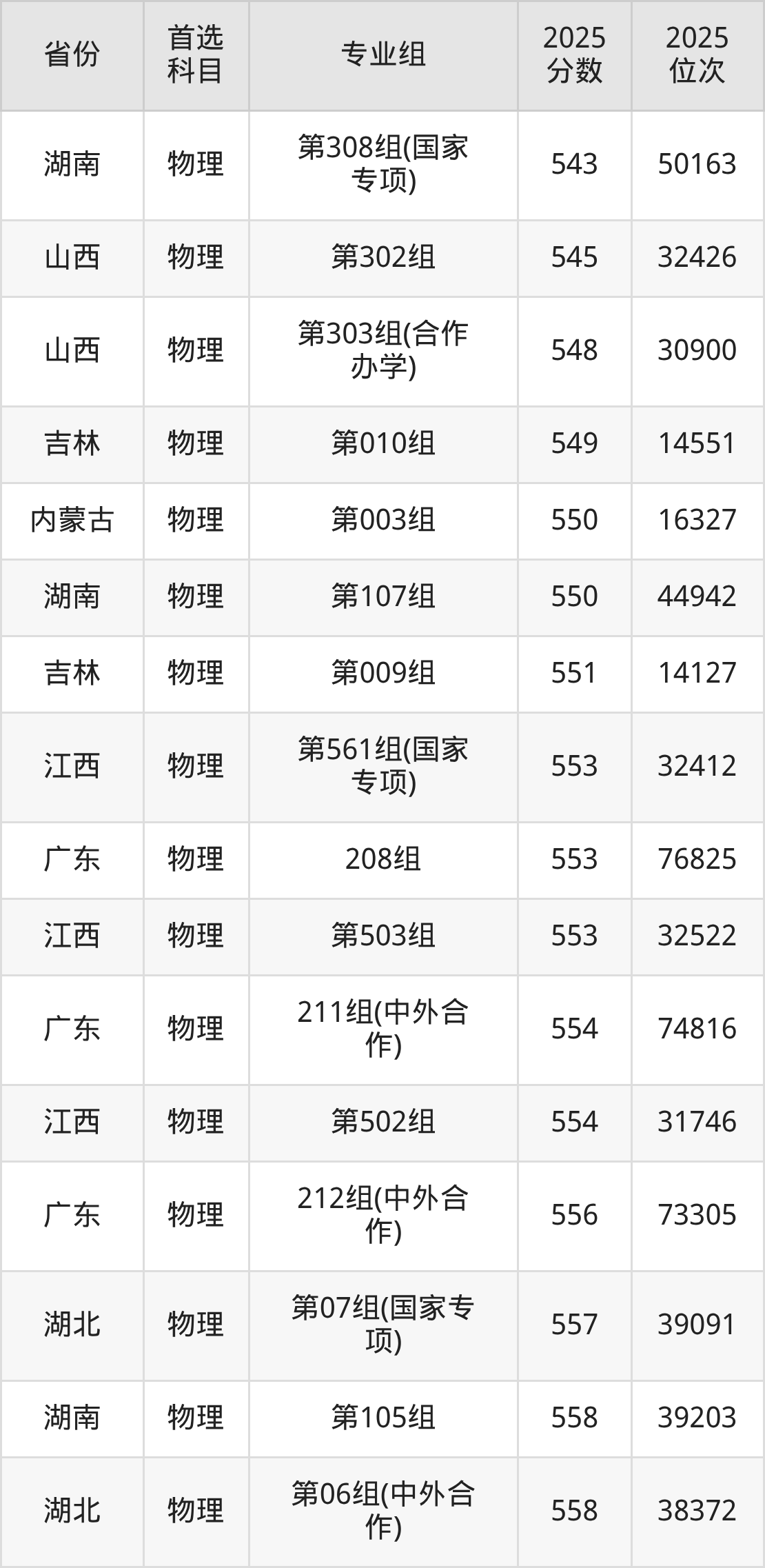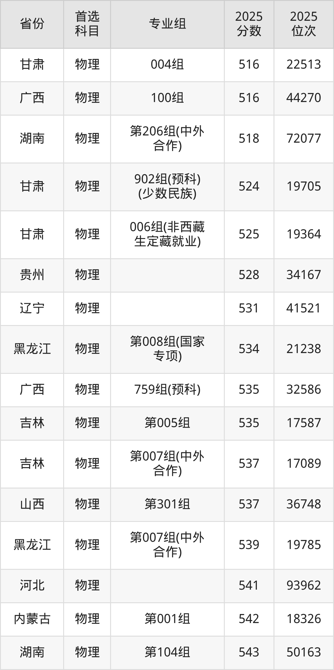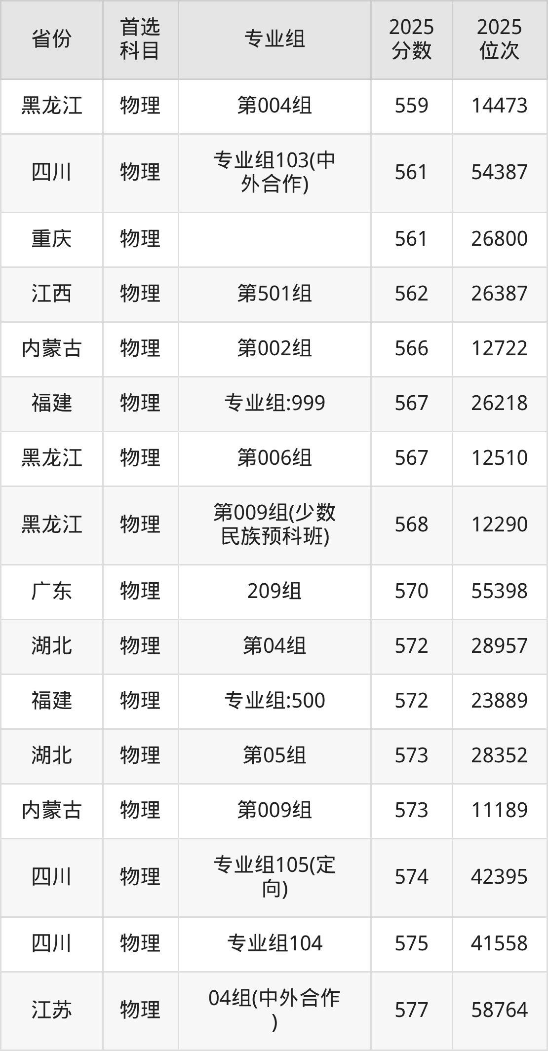 物理类:第004组559分、14473名,第005组579分、9915名,第006组567分、12510名,第007组(中外合作)539分、19785名,第008组(国家专项)534分、21238名,第009组(少数民族预科班)568分、12290名;