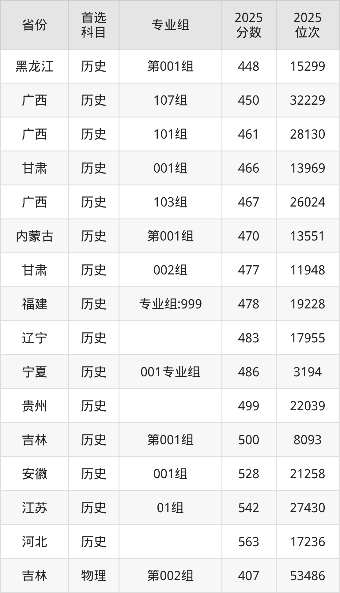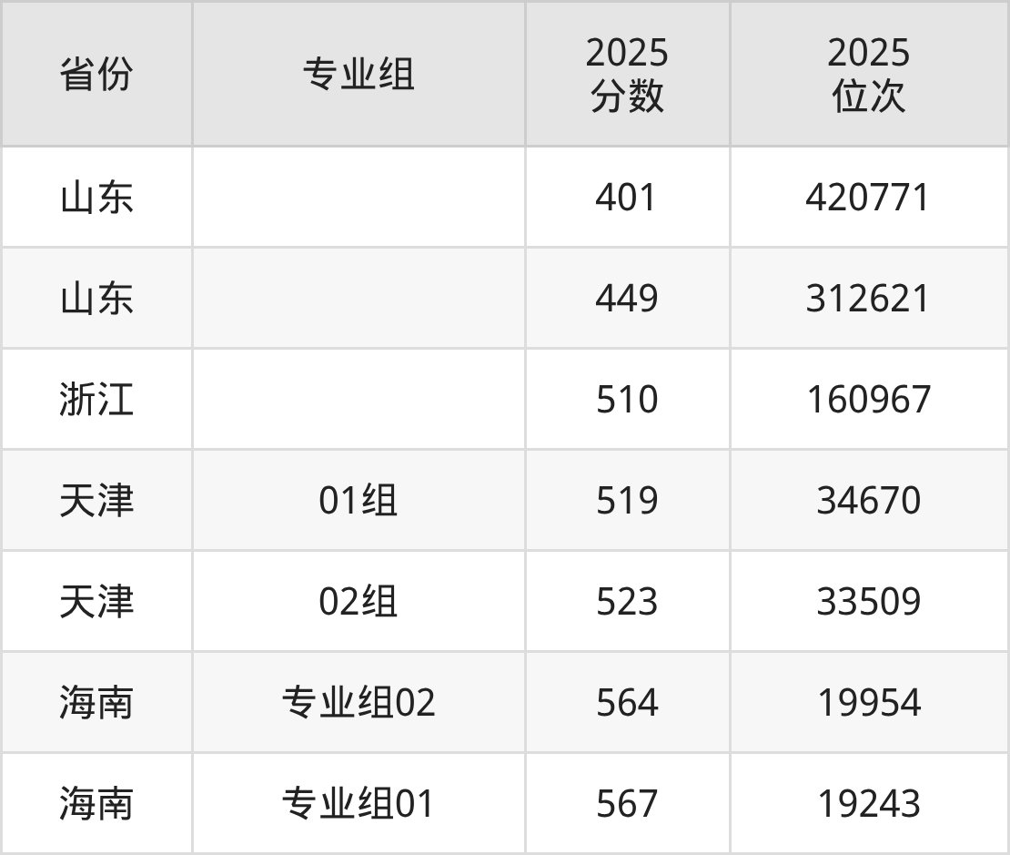 最低分对应地区为山东,录取位次为420771,超二段线251分;最高分对应地区为海南(专业组01),录取位次为19243,超本科线87分。