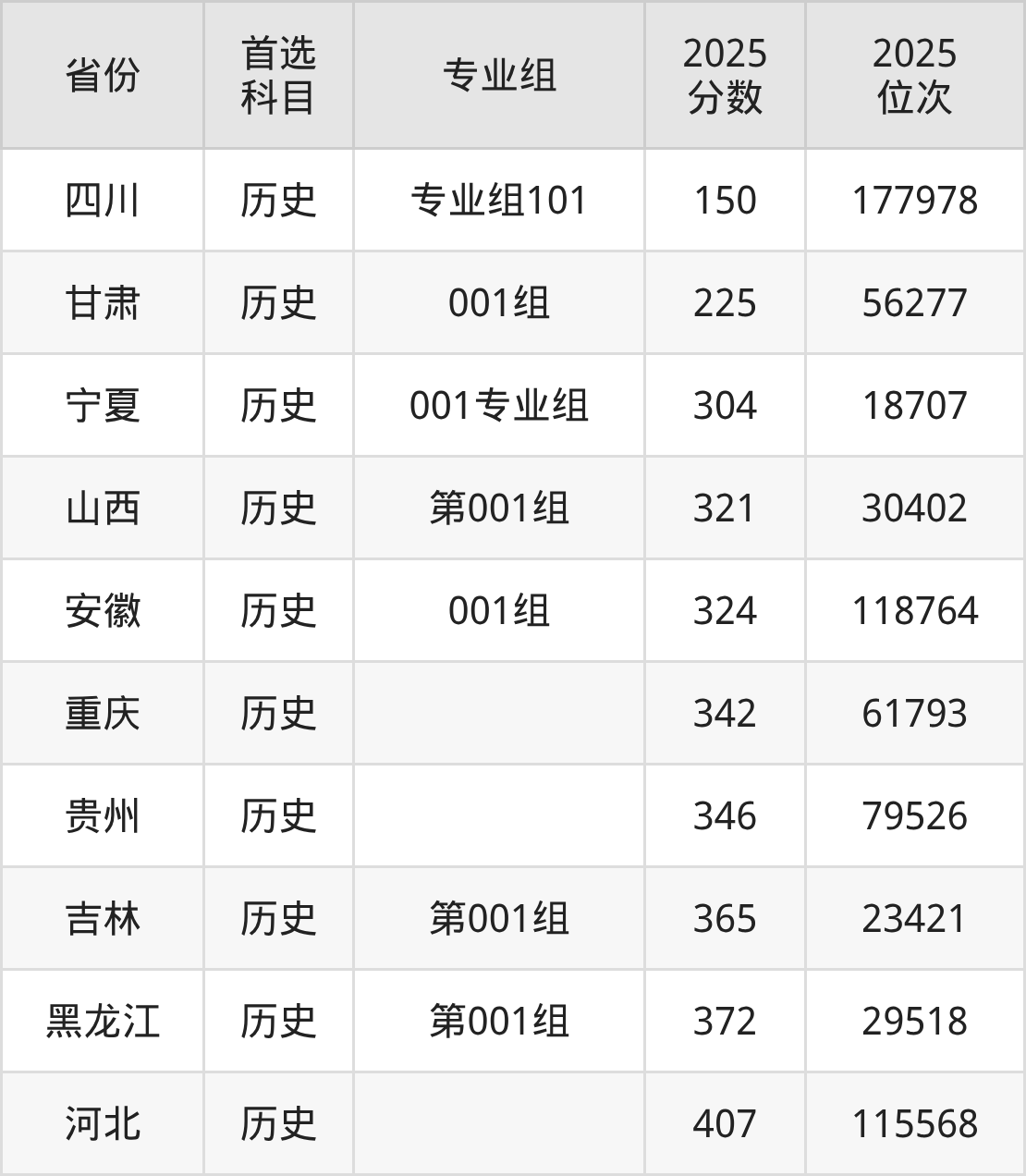 历史类最低分对应地区为四川(专业组101),录取位次为177978;最高分对应地区为河北,录取位次为115568,超专科线207分。