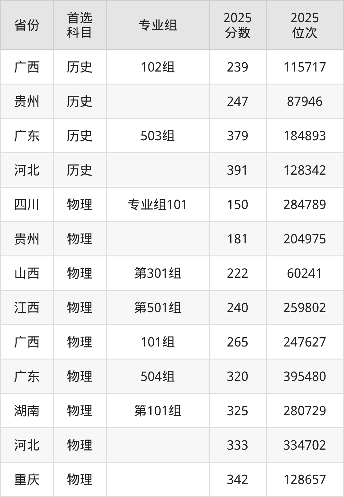 历史类最低分对应地区为广西(102组),录取位次为115717,超专科线39分;最高分对应地区为河北,录取位次为128342,超专科线191分。