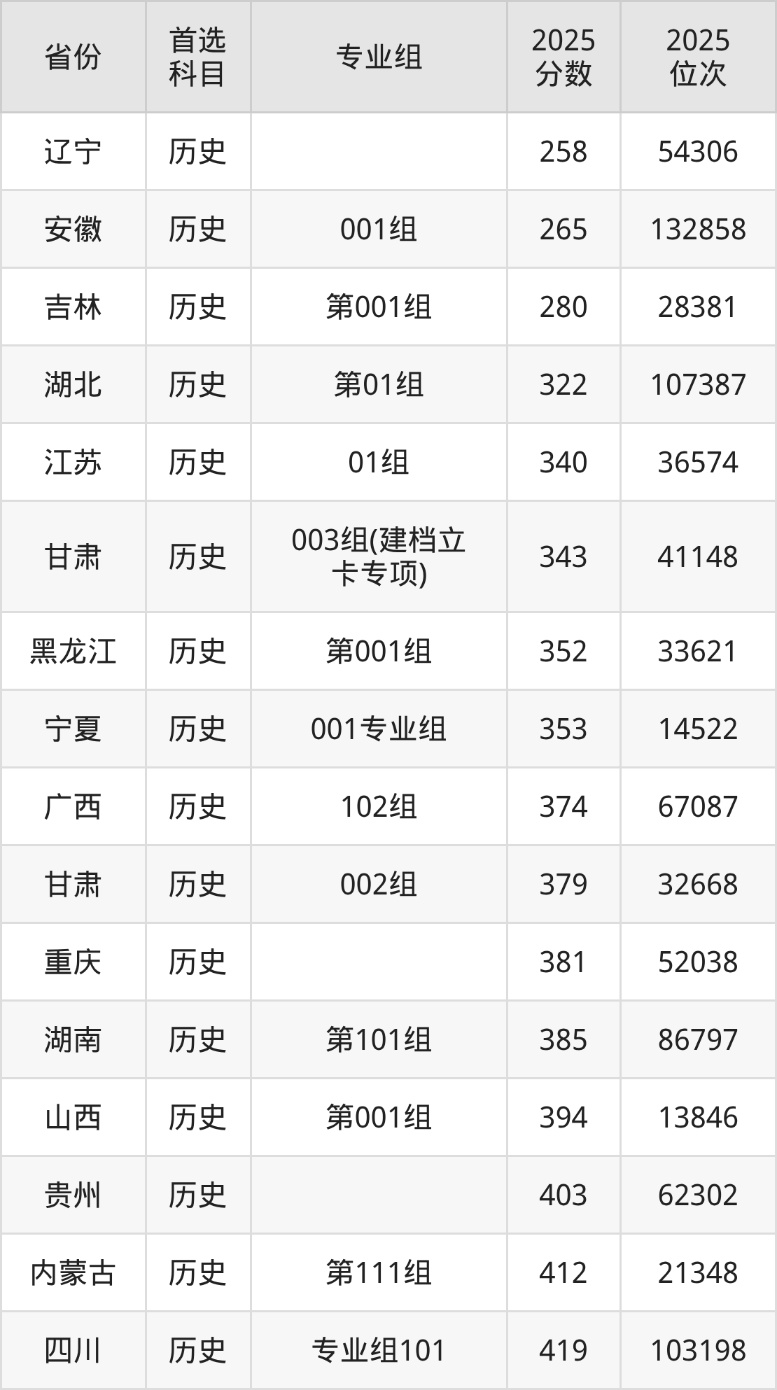 历史类最低分对应地区为辽宁,录取位次为54306,超专科线108分;最高分对应地区为江西(第101组),录取位次为71057。