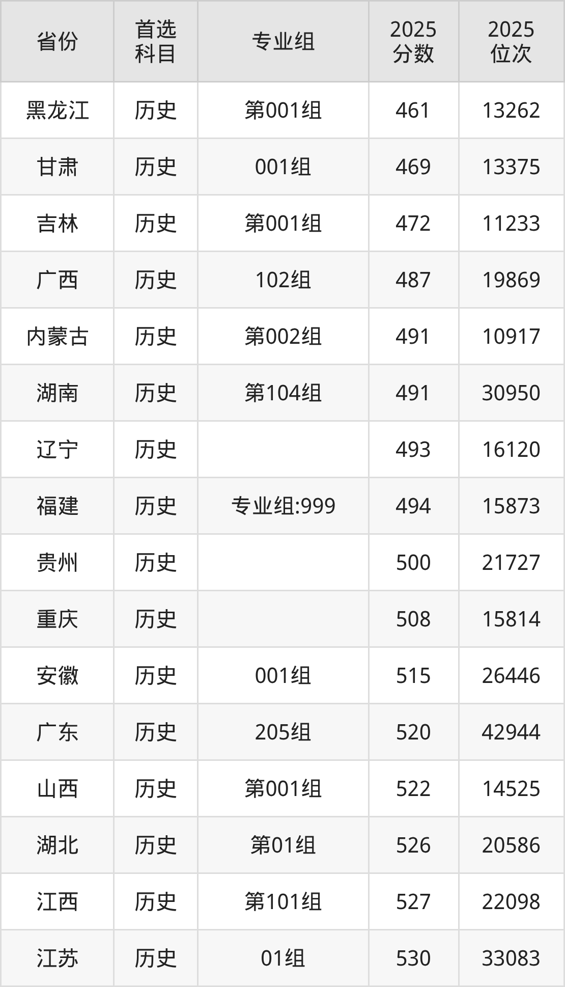 历史类最低分对应地区为黑龙江(第001组),录取位次为13262,超本科线56分;最高分对应地区为河北,录取位次为26359,超本科线65分。