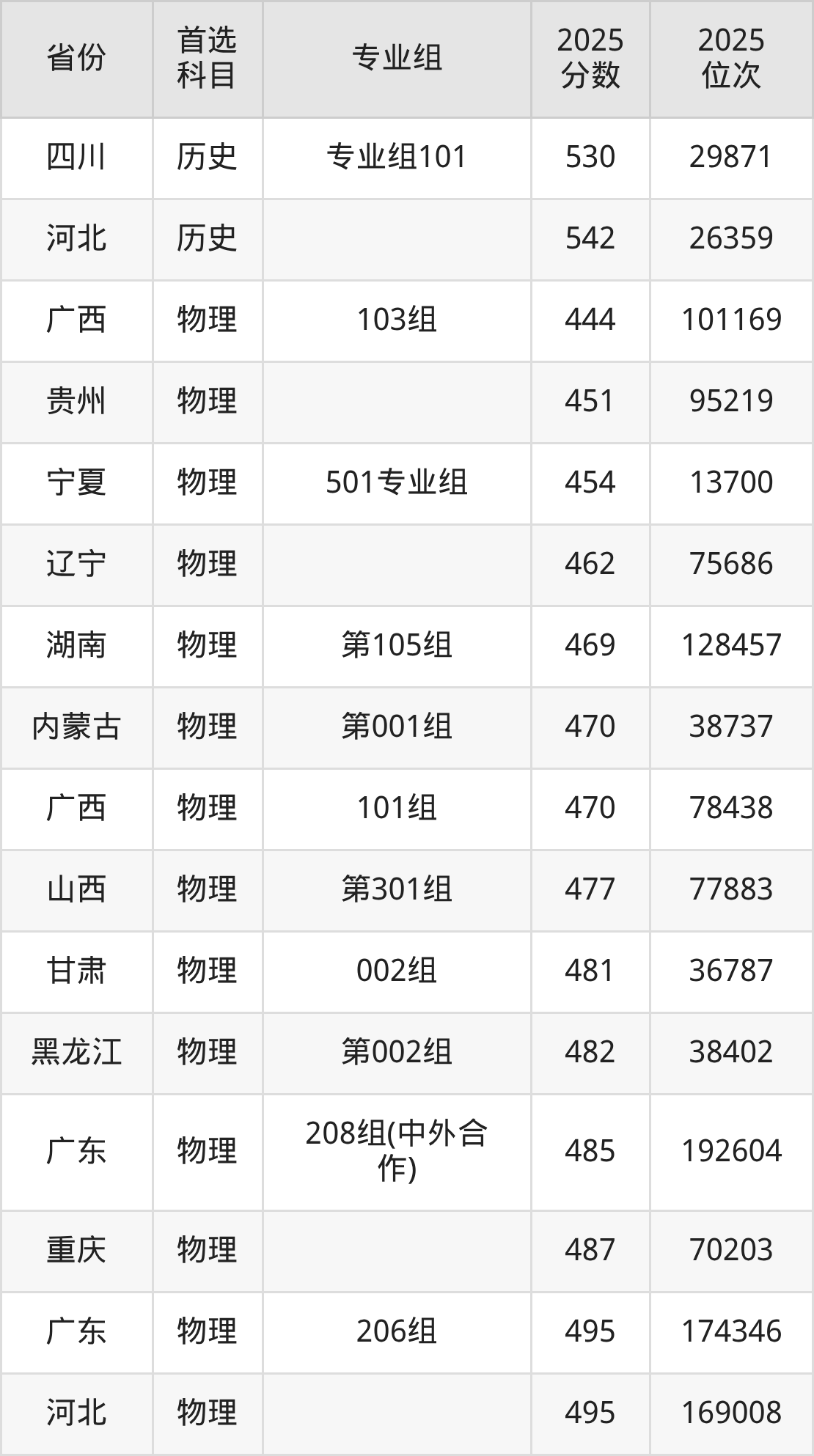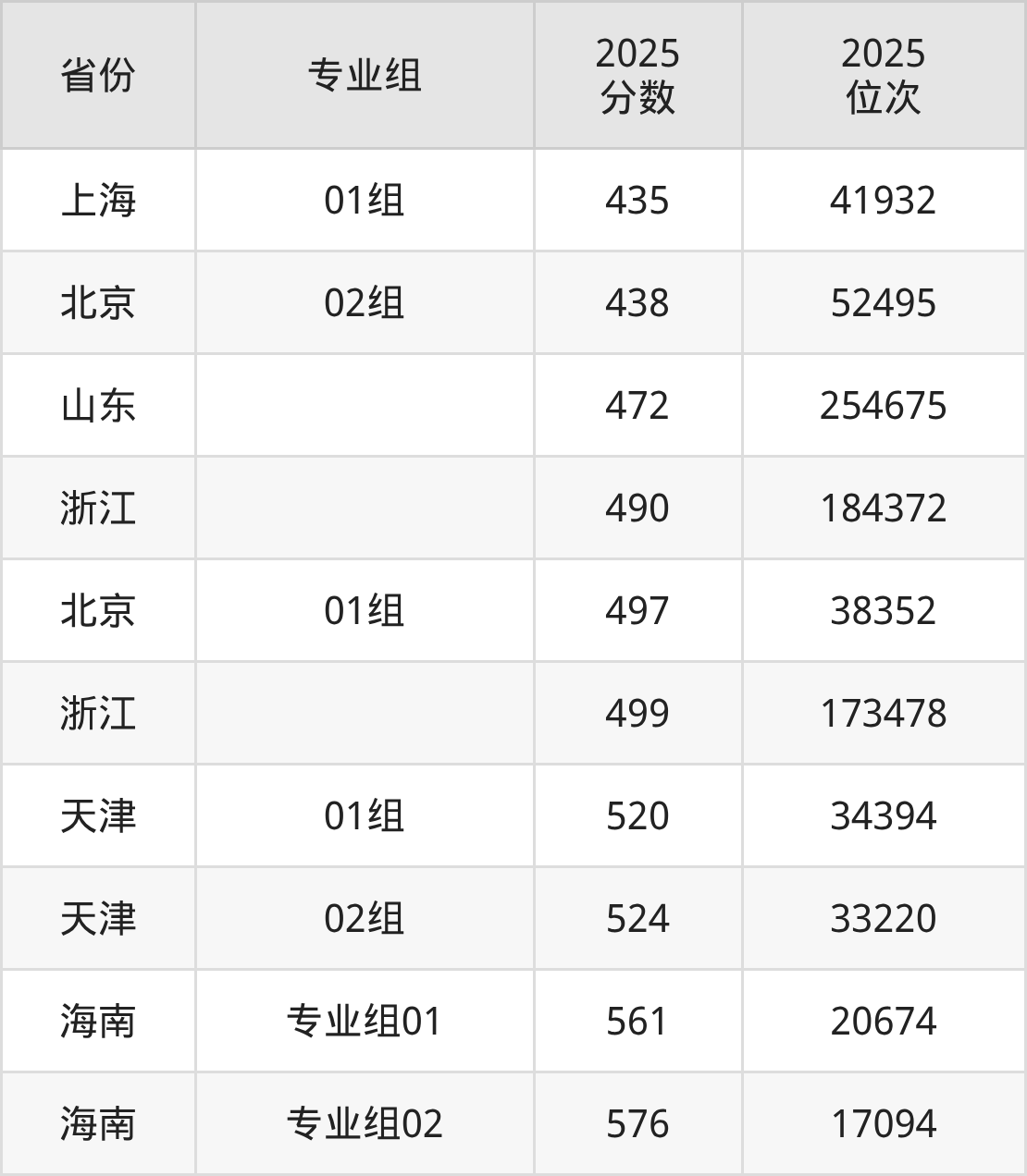 最低分对应地区为上海(01组),录取位次为41932,超本科线33分;最高分对应地区为海南(专业组02),录取位次为17094,超本科线96分。