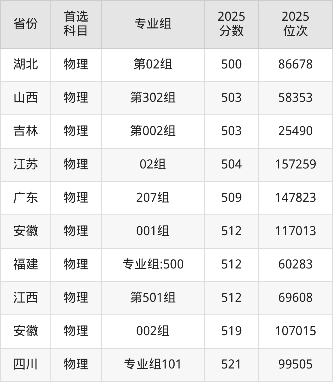 物理类最低分对应地区为广西(103组),录取位次为101169,超本科线74分;最高分对应地区为四川(专业组101),录取位次为99505,超本科B83分。
