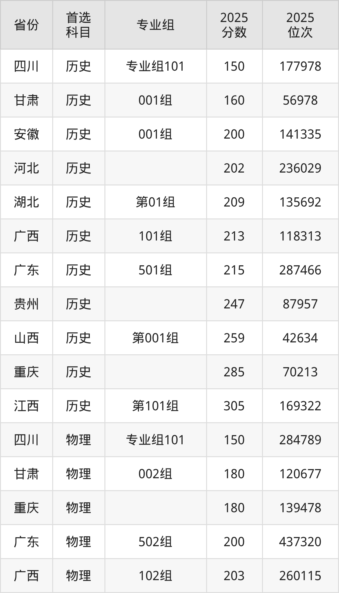 历史类最低分对应地区为四川(专业组101),录取位次为177978;最高分对应地区为江西(第101组),录取位次为169322,超专科线15分。