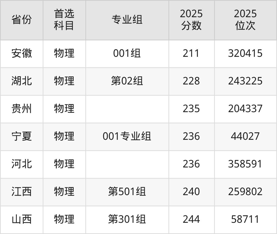 物理类最低分对应地区为四川(专业组101),录取位次为284789;最高分对应地区为山西(第301组),录取位次为58711,超专科线144分。
