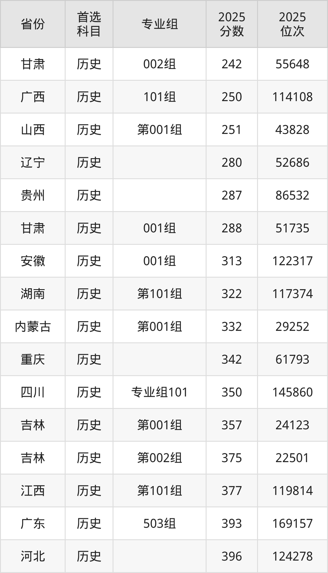 历史类最低分对应地区为甘肃(002组),录取位次为55648,超专科线82分;最高分对应地区为河北,录取位次为124278,超专科线196分。