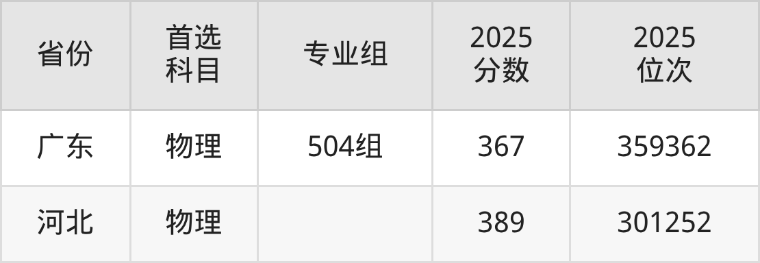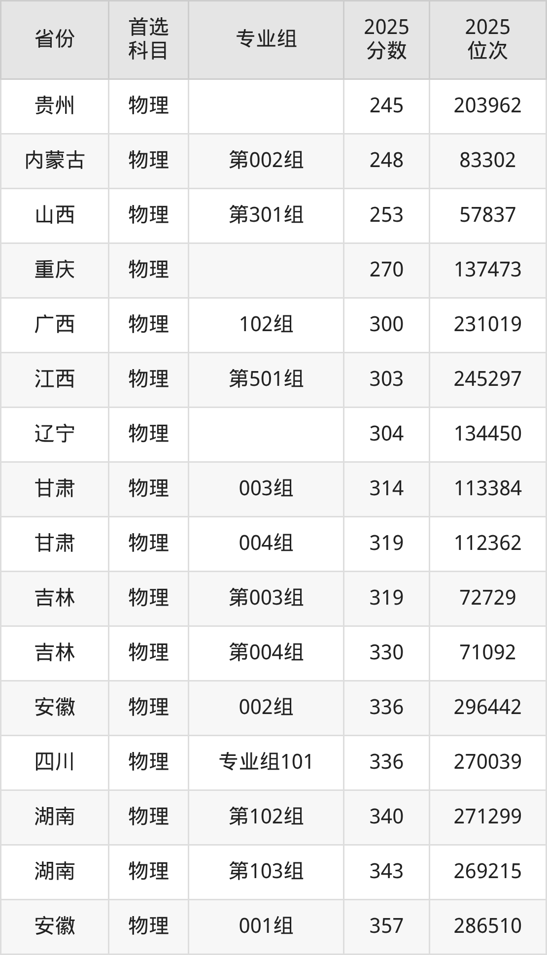 物理类最低分对应地区为贵州,录取位次为203962,超专科线65分;最高分对应地区为河北,录取位次为301252,超专科线189分。