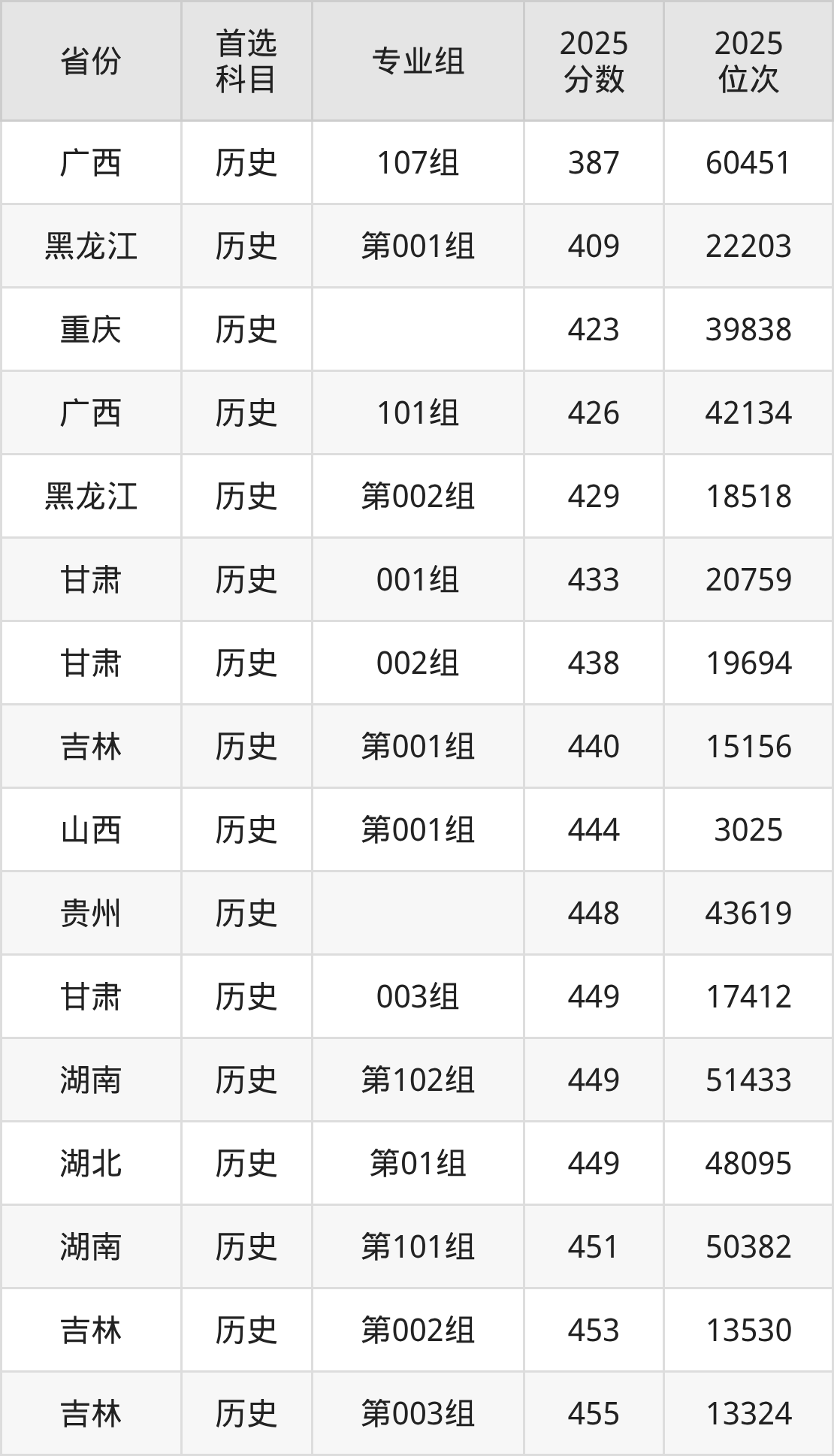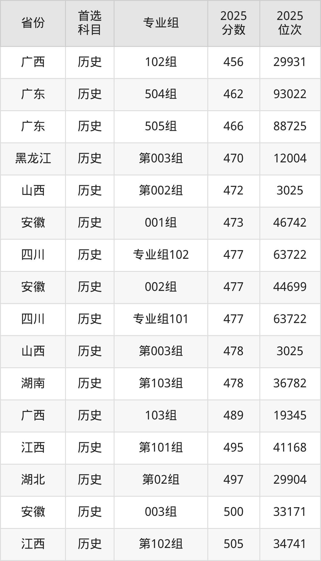 历史类最低分对应地区为广西(107组),录取位次为60451,超专科线187分;最高分对应地区为江西(第103组),录取位次为24235,超专科线233分。