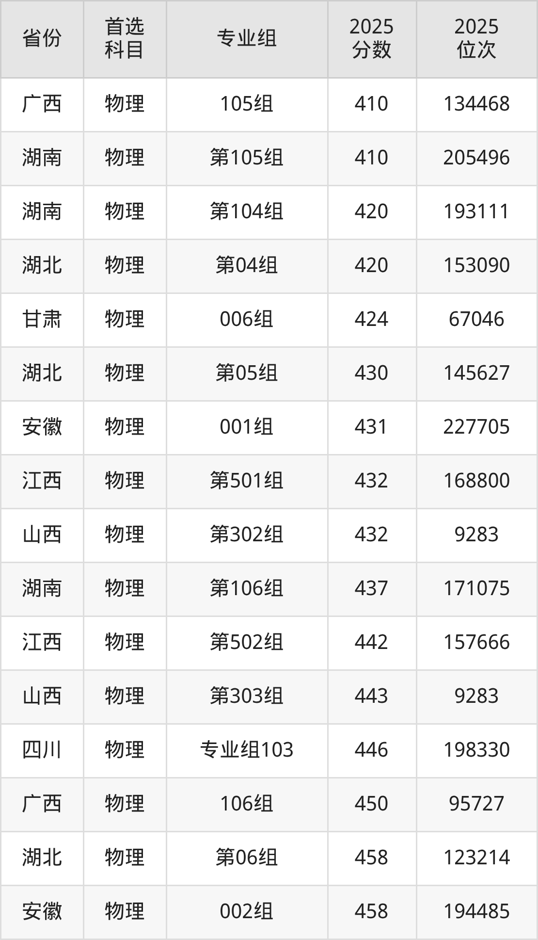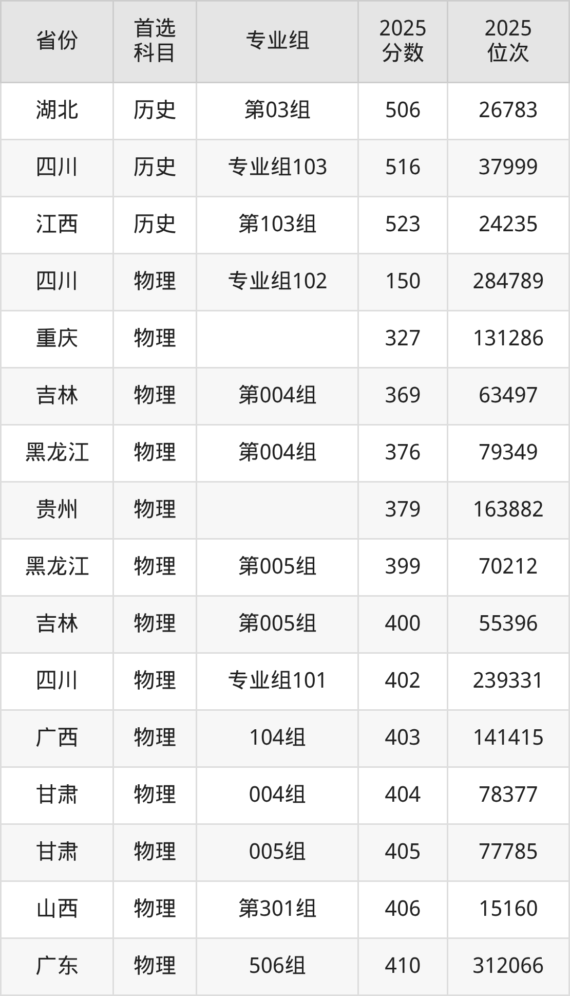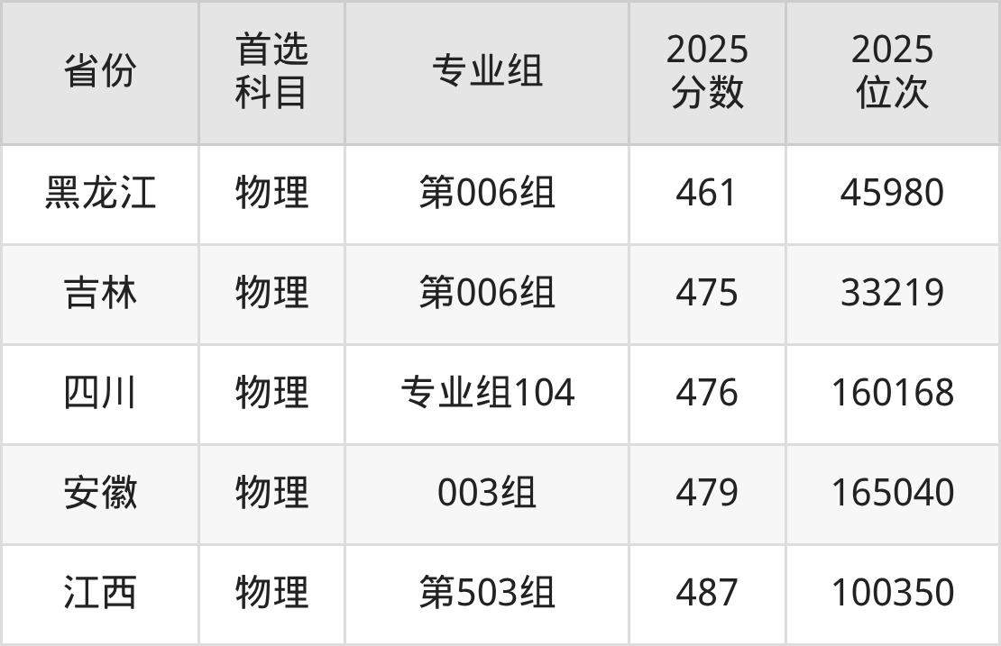 物理类最低分对应地区为四川(专业组102),录取位次为284789;最高分对应地区为江西(第503组),录取位次为100350,超专科线247分。