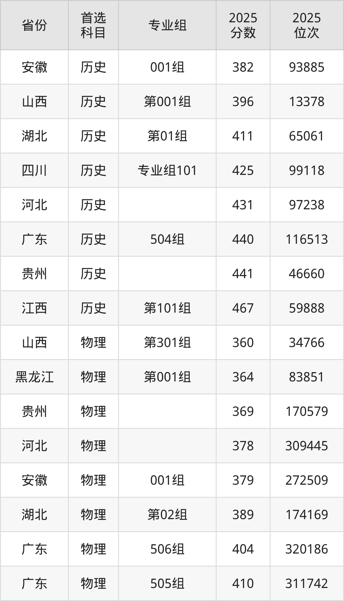 历史类最低分对应地区为安徽(001组),录取位次为93885,超专科线182分;最高分对应地区为江西(第101组),录取位次为59888,超专科线177分。