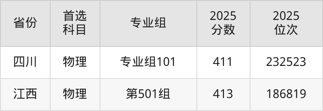 物理类最低分对应地区为山西(第301组),录取位次为34766;最高分对应地区为江西(第501组),录取位次为186819,超专科线173分。