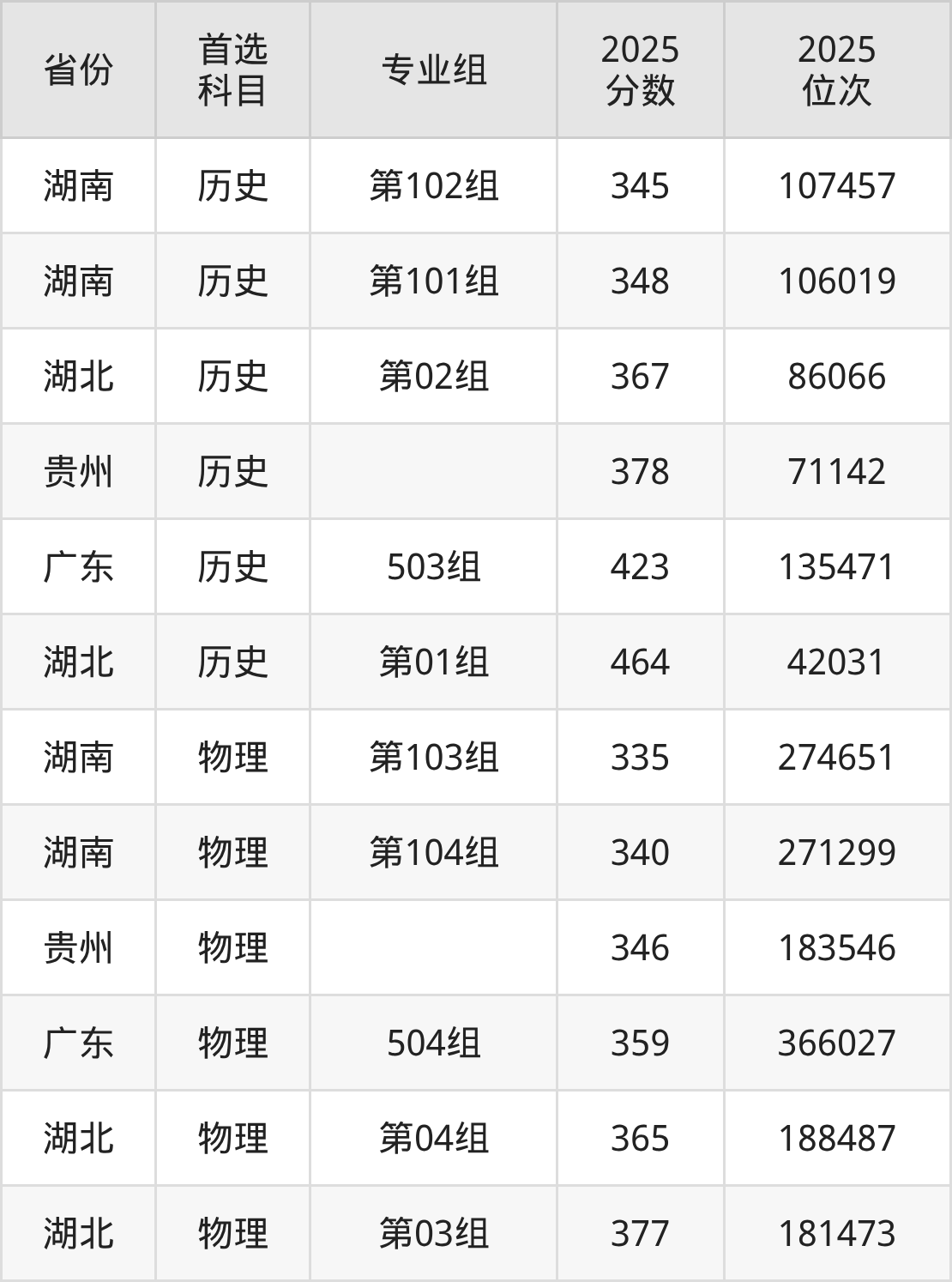 物理类最低分对应地区为湖南(第103组),录取位次为274651,超专科线135分;最高分对应地区为湖北(第03组),录取位次为181473,超专科线177分。