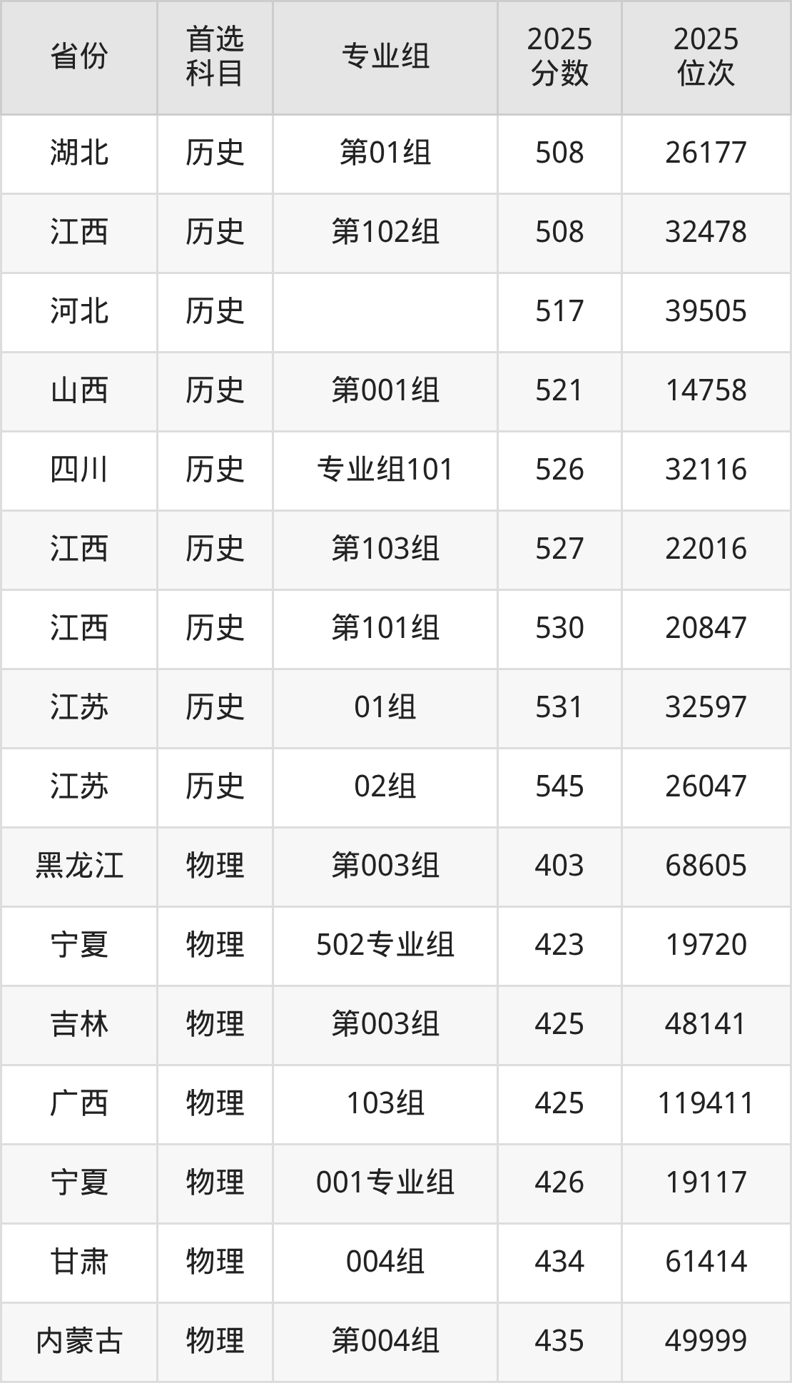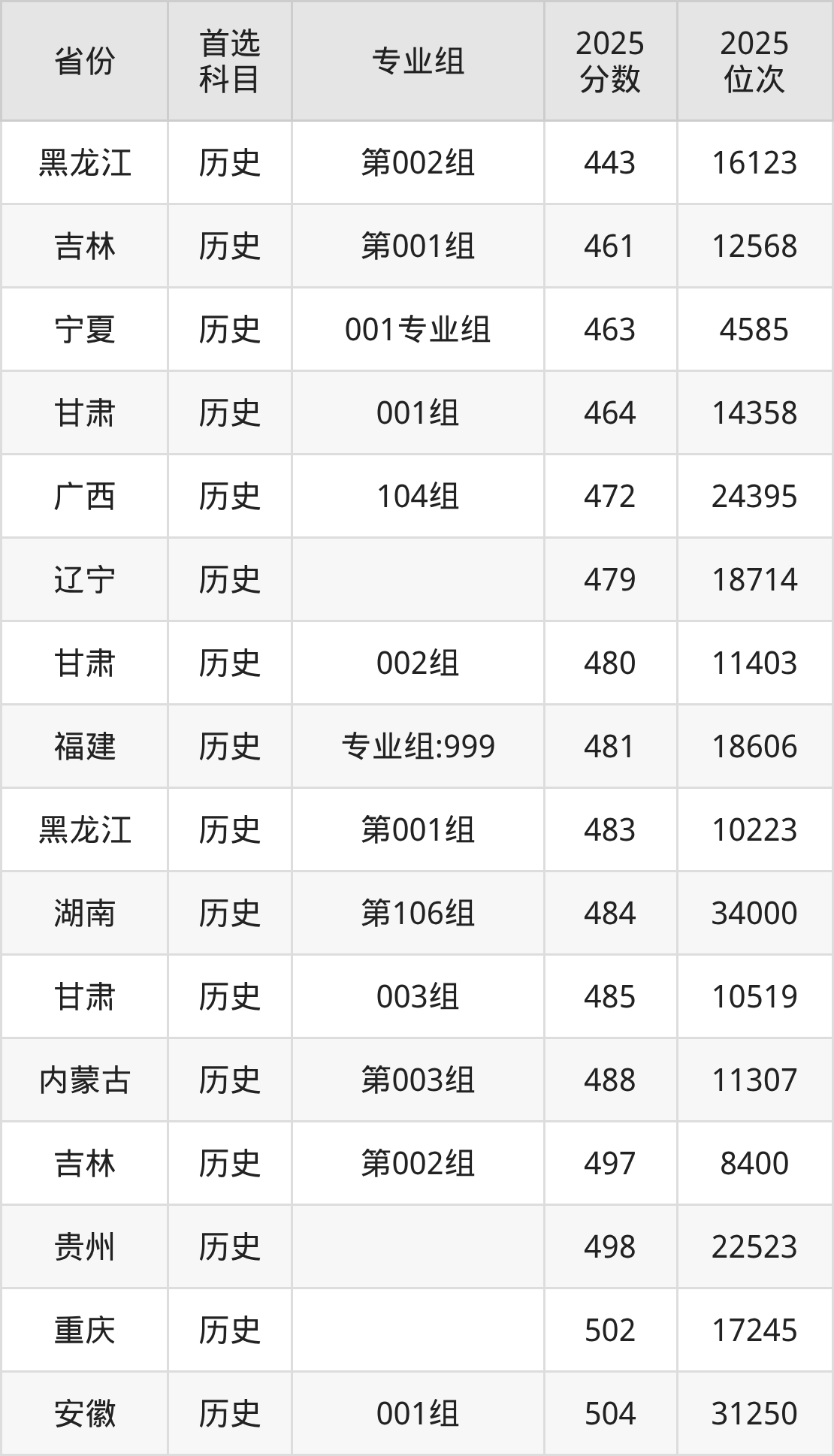历史类最低分对应地区为黑龙江(第002组),录取位次为16123,超本科线38分;最高分对应地区为江苏(02组),录取位次为26047,超本科线63分。