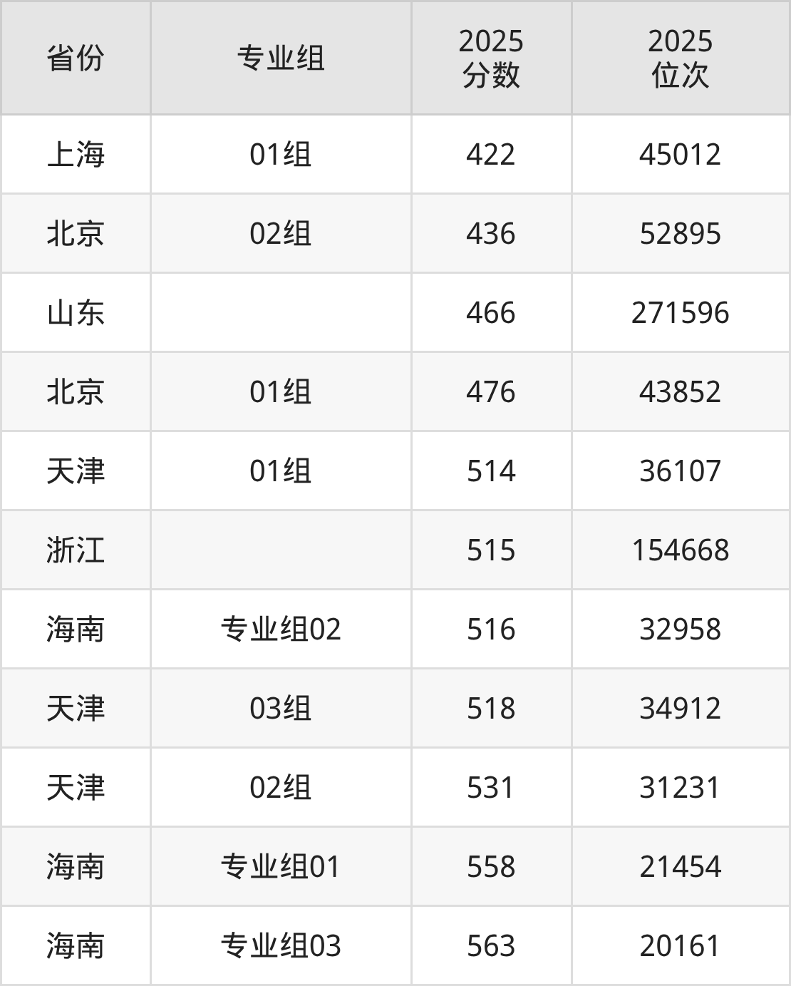 最低分对应地区为上海(01组),录取位次为45012;最高分对应地区为海南(专业组03),录取位次为20161,超本科线83分。