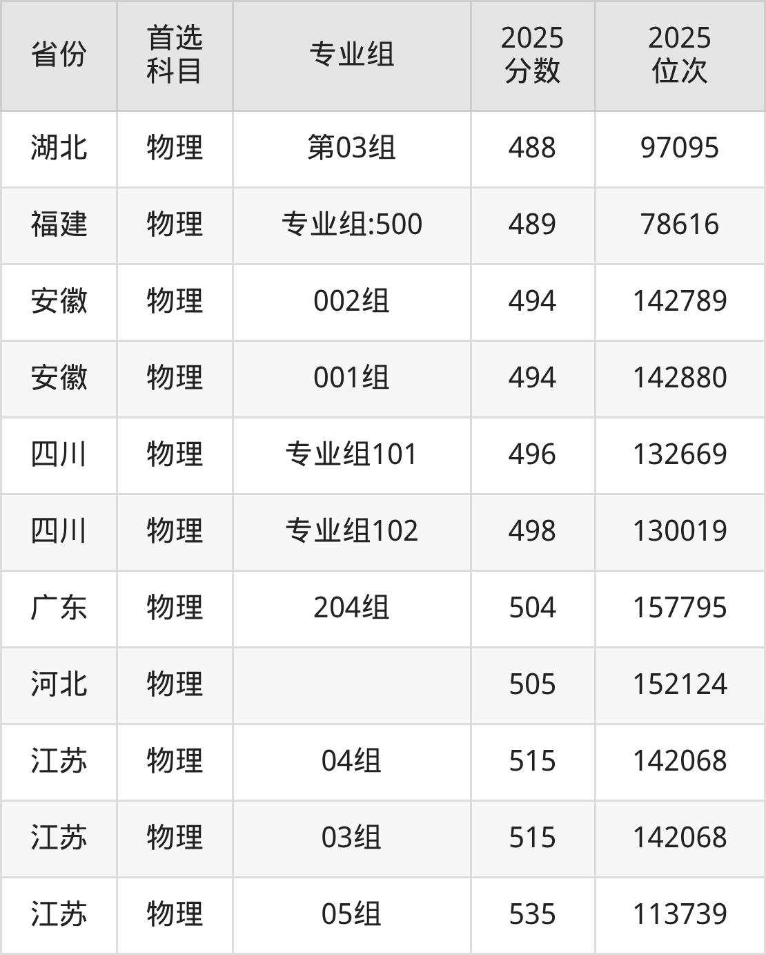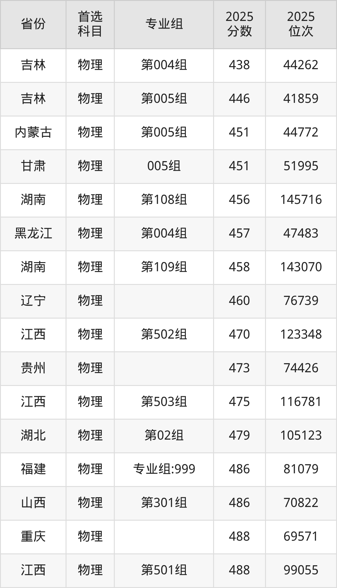 物理类最低分对应地区为黑龙江(第003组),录取位次为68605,超本科线43分;最高分对应地区为江苏(05组),录取位次为113739,超本科线72分。