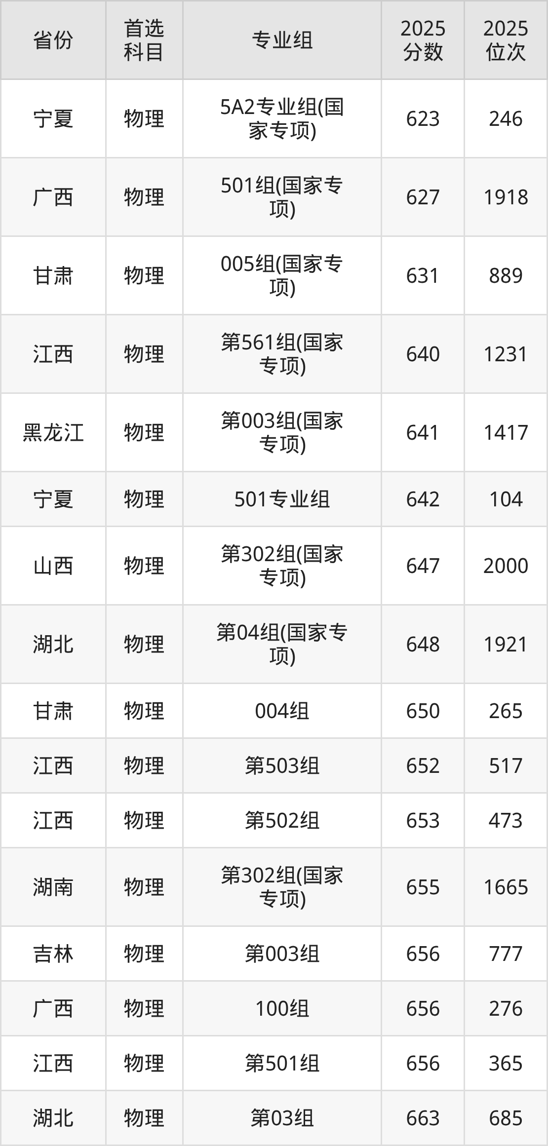 物理类最低分对应地区为宁夏(5A2专业组(国家专项)),录取位次为246,超本科B251分;最高分对应地区为内蒙古(第001组),录取位次为190,超本科线305分。