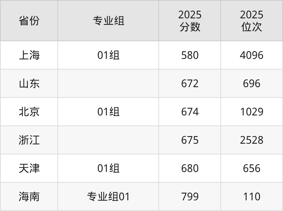 最低分对应地区为上海(01组),录取位次为4096,超本科线178分;最高分对应地区为海南(专业组01),录取位次为110,超本科线319分。