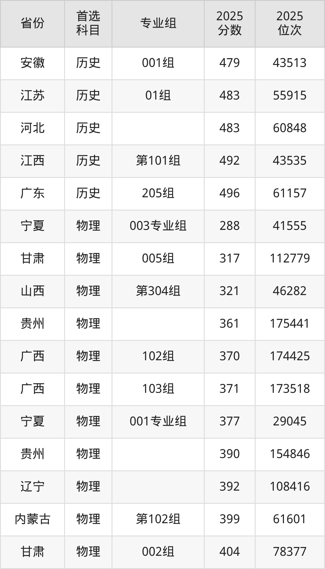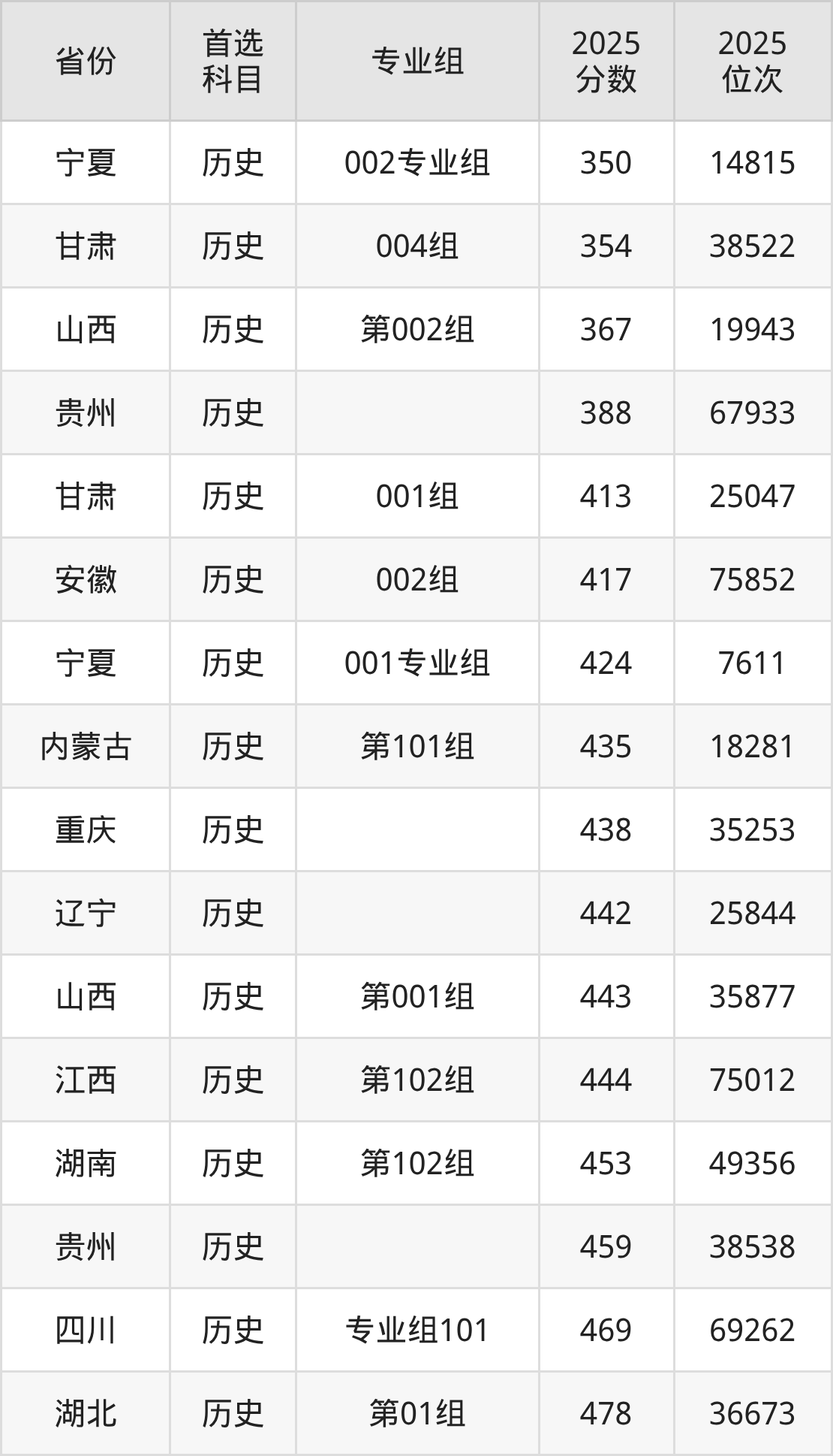 历史类最低分对应地区为宁夏(002专业组),录取位次为14815;最高分对应地区为广东(205组),录取位次为61157,超本科线32分。