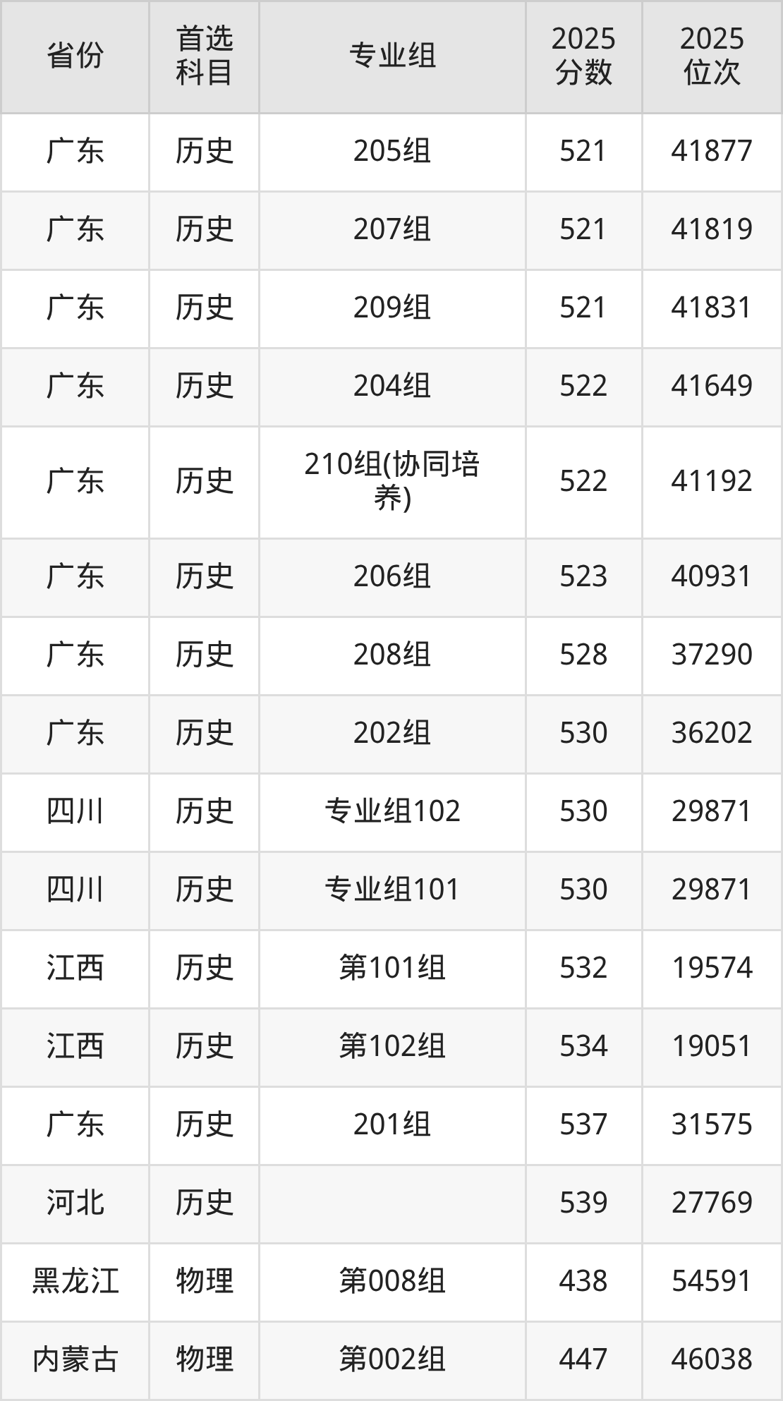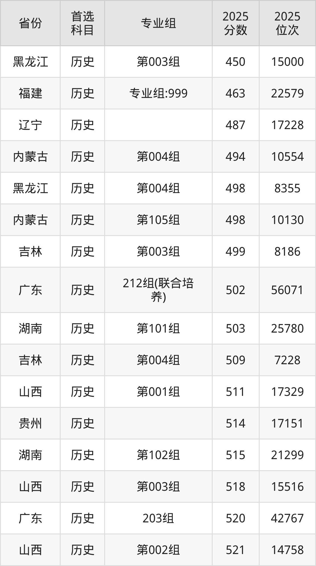 历史类:201组537分、31575名,202组530分、36202名,203组520分、42767名,204组522分、41649名,205组521分、41877名,206组523分、40931名,207组521分、41819名,208组528分、37290名,209组521分、41831名,210组(协同培养)522分、41192名,212组(联合培养)502分、56071名;
