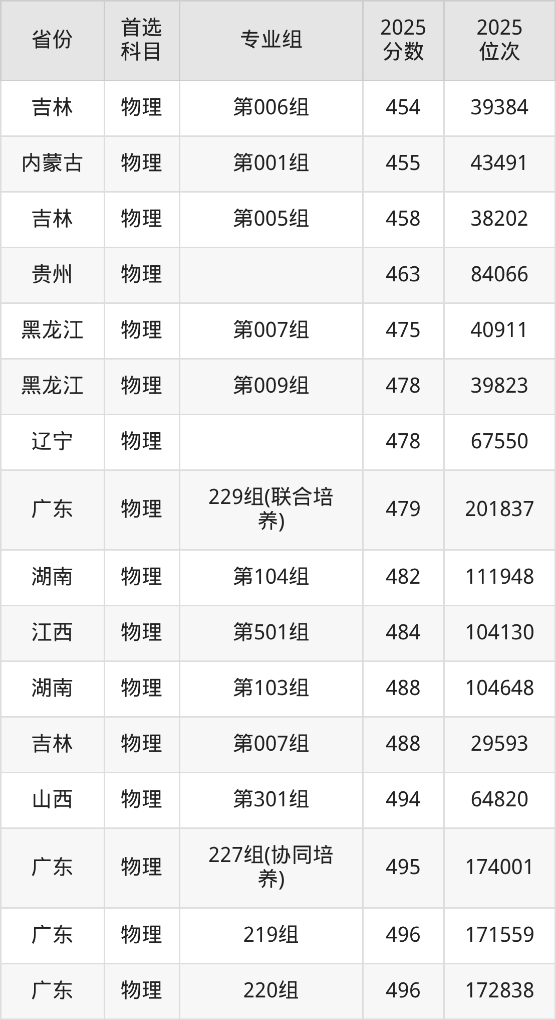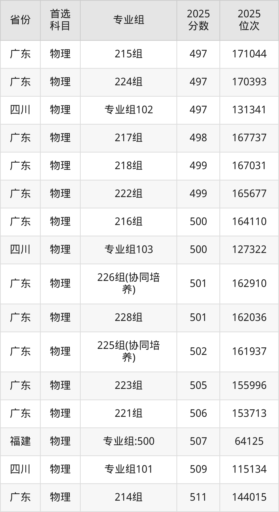物理类:213组519分、131752名,214组511分、144015名,215组497分、171044名,216组500分、164110名,217组498分、167737名,218组499分、167031名,219组496分、171559名,220组496分、172838名,221组506分、153713名,222组499分、165677名,223组505分、155996名,224组497分、170393名,225组(协同培养)502分、161937名,226组(协同培养)501分、162910名,227组(协同培养)495分、174001名,228组501分、162036名,229组(联合培养)479分、201837名;