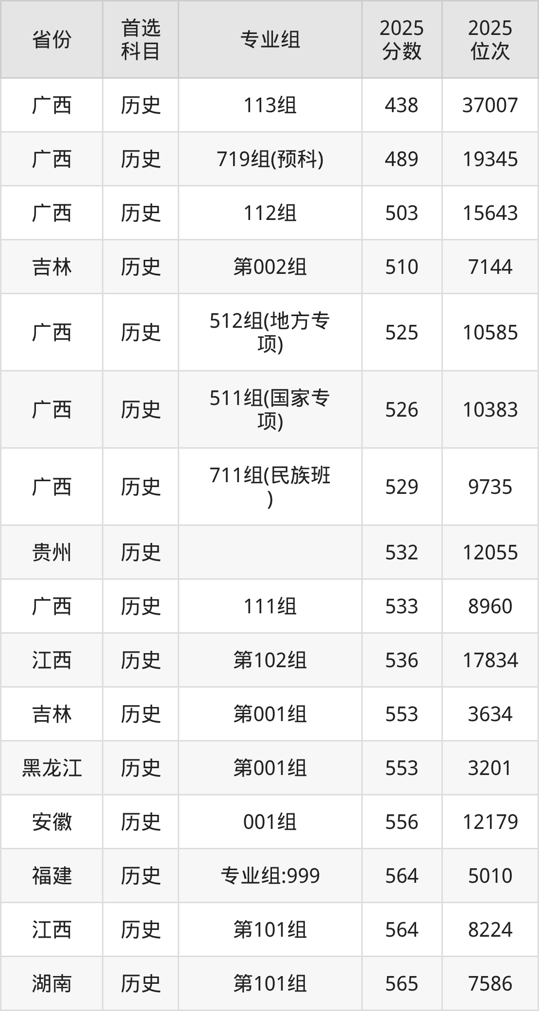 历史类:111组533分、8960名,112组503分、15643名,113组438分、37007名,511组(国家专项)526分、10383名,512组(地方专项)525分、10585名,711组(民族班)529分、9735名,719组(预科)489分、19345名;