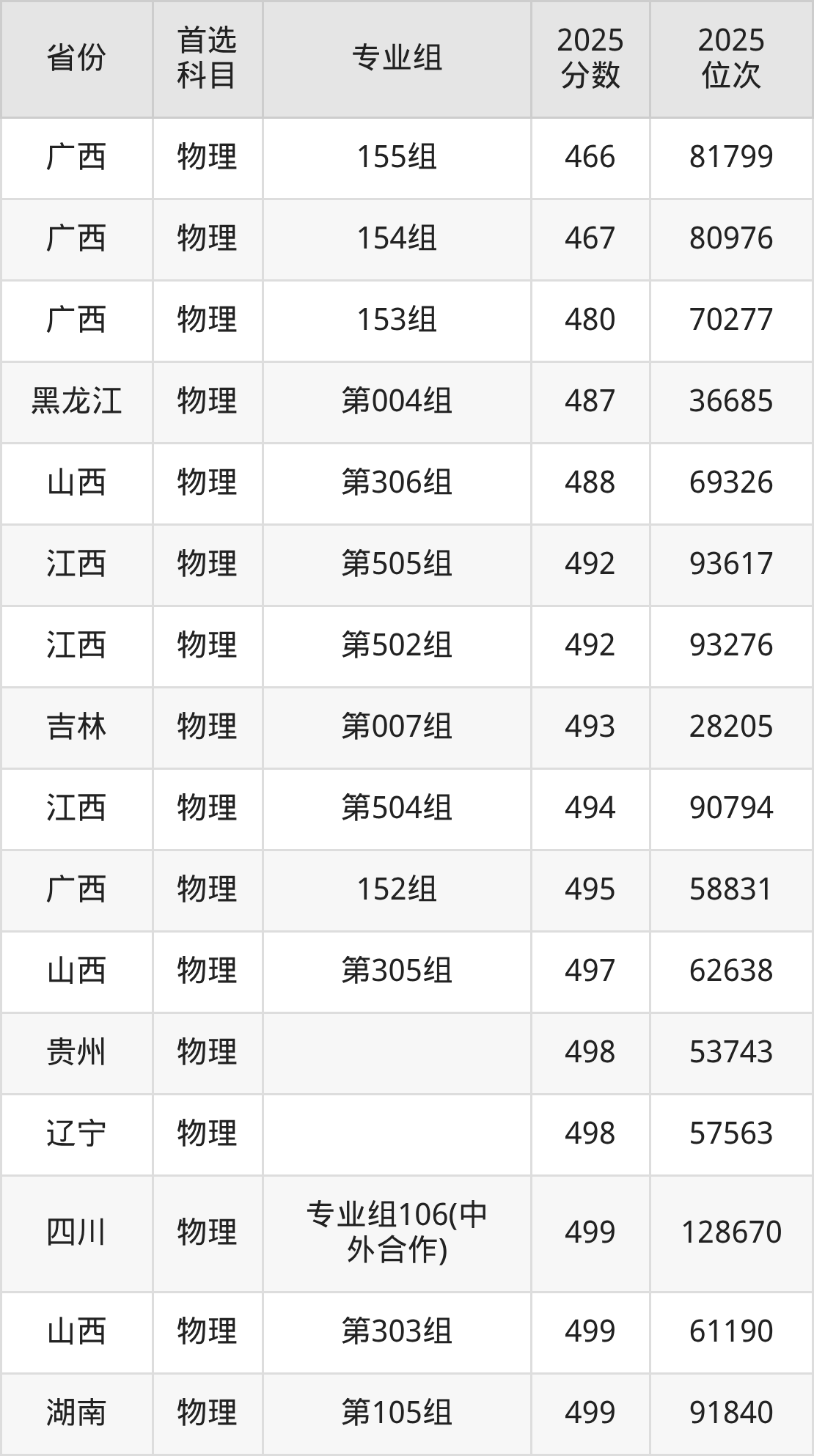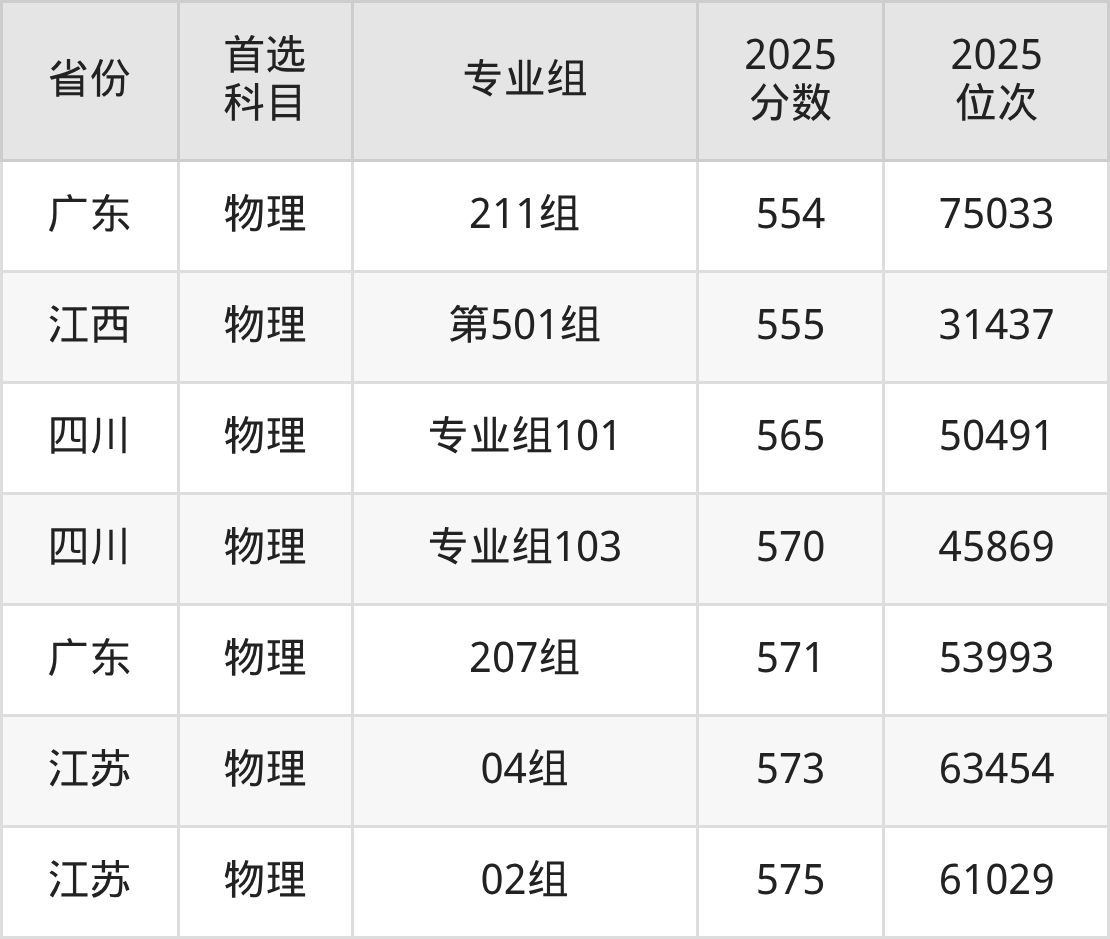 物理类最低分对应地区为广西(158组),录取位次为141415,超专科线203分;最高分对应地区为江苏(02组),录取位次为61029,超本科线112分。