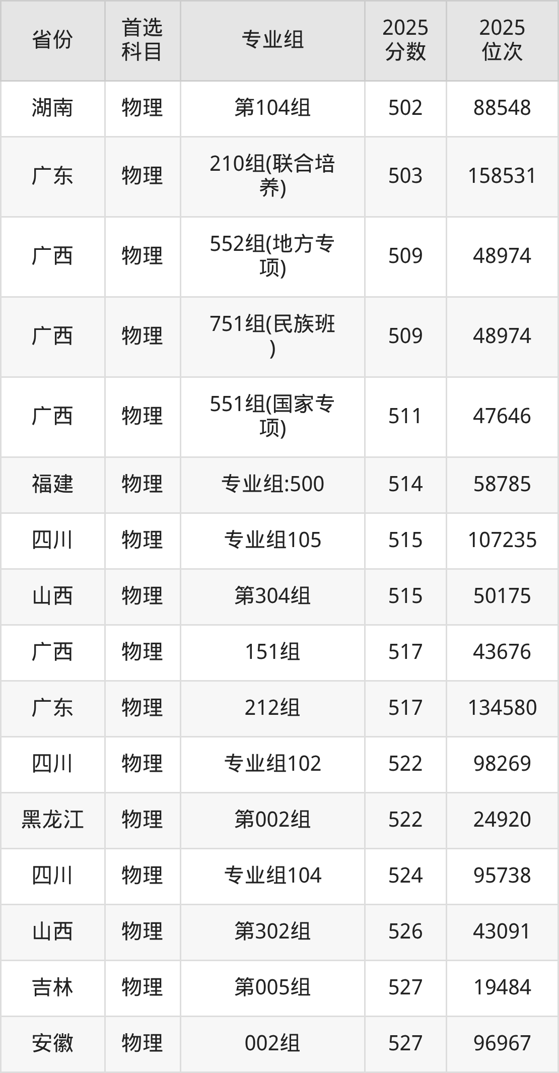 物理类:151组517分、43676名,152组495分、58831名,153组480分、70277名,154组467分、80976名,155组466分、81799名,156组412分、132436名,157组413分、131422名,158组403分、141415名,551组(国家专项)511分、47646名,552组(地方专项)509分、48974名,553组(国家专项)545分、27015名,554组(地方专项)530分、35484名,751组(民族班)509分、48974名,759组(预科)461分、86002名,951组455分、91203名;