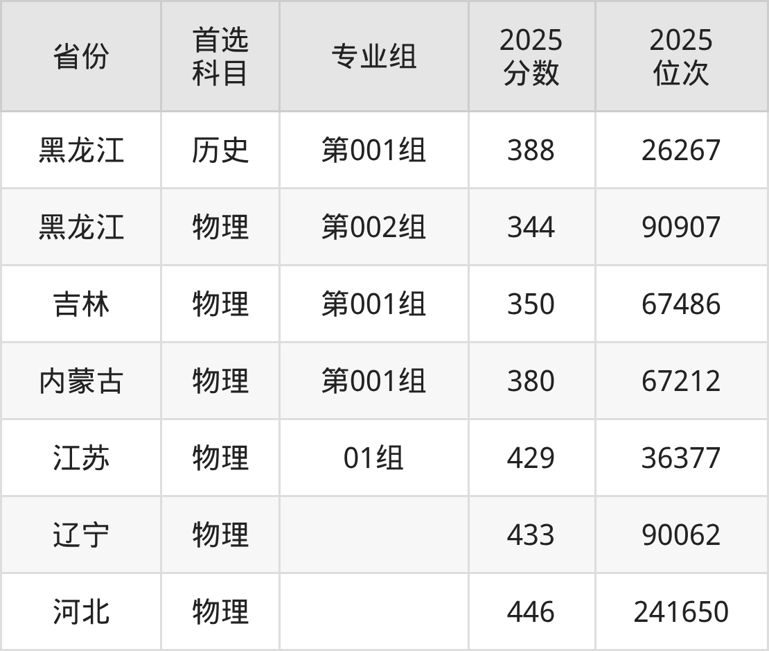 物理类最低分对应地区为黑龙江(第002组),录取位次为90907,超专科线184分;最高分对应地区为河北,录取位次为241650,超专科线246分。