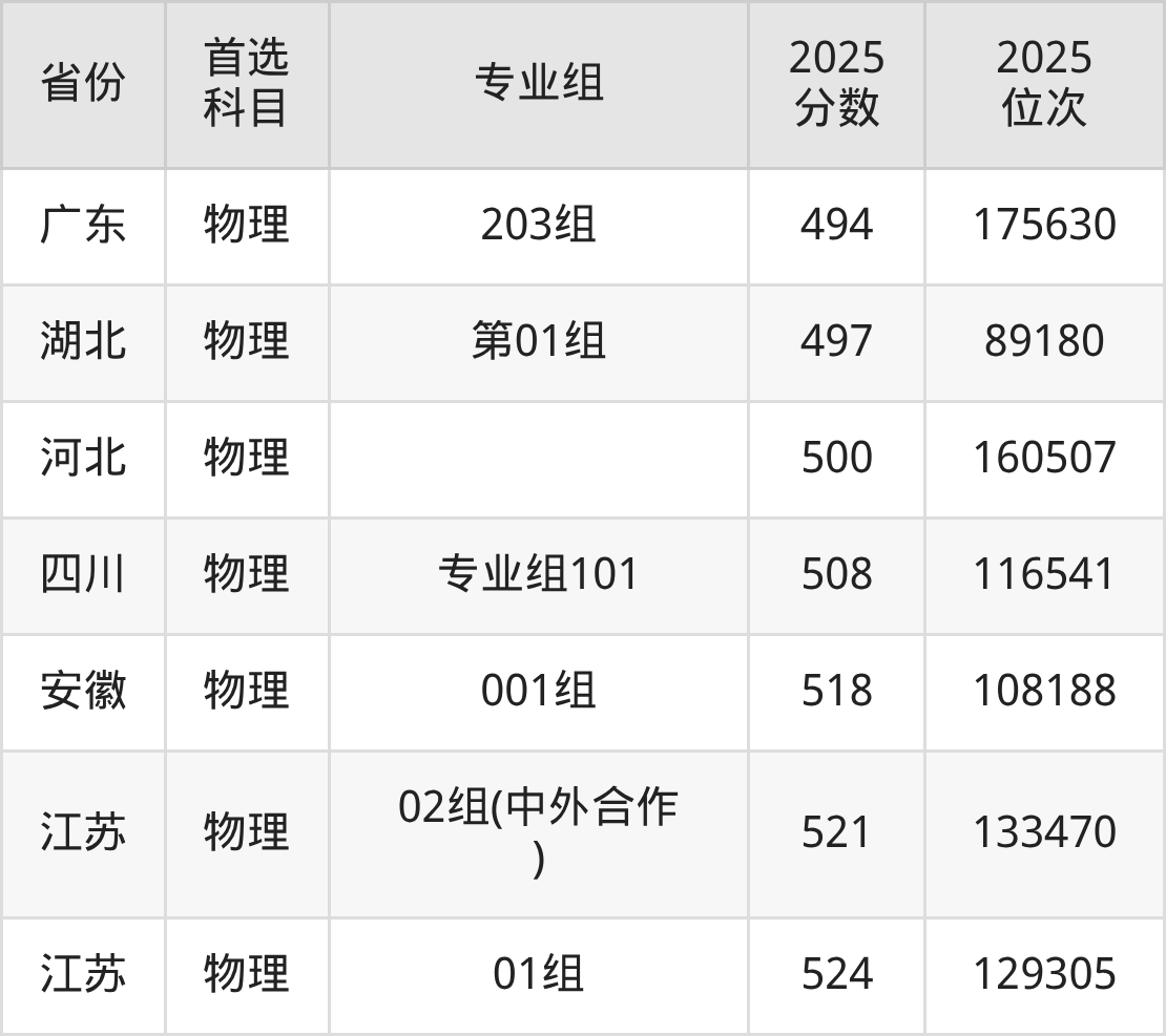 物理类最低分对应地区为广西(101组),录取位次为121395,超本科线53分;最高分对应地区为江苏(01组),录取位次为129305,超本科线61分。