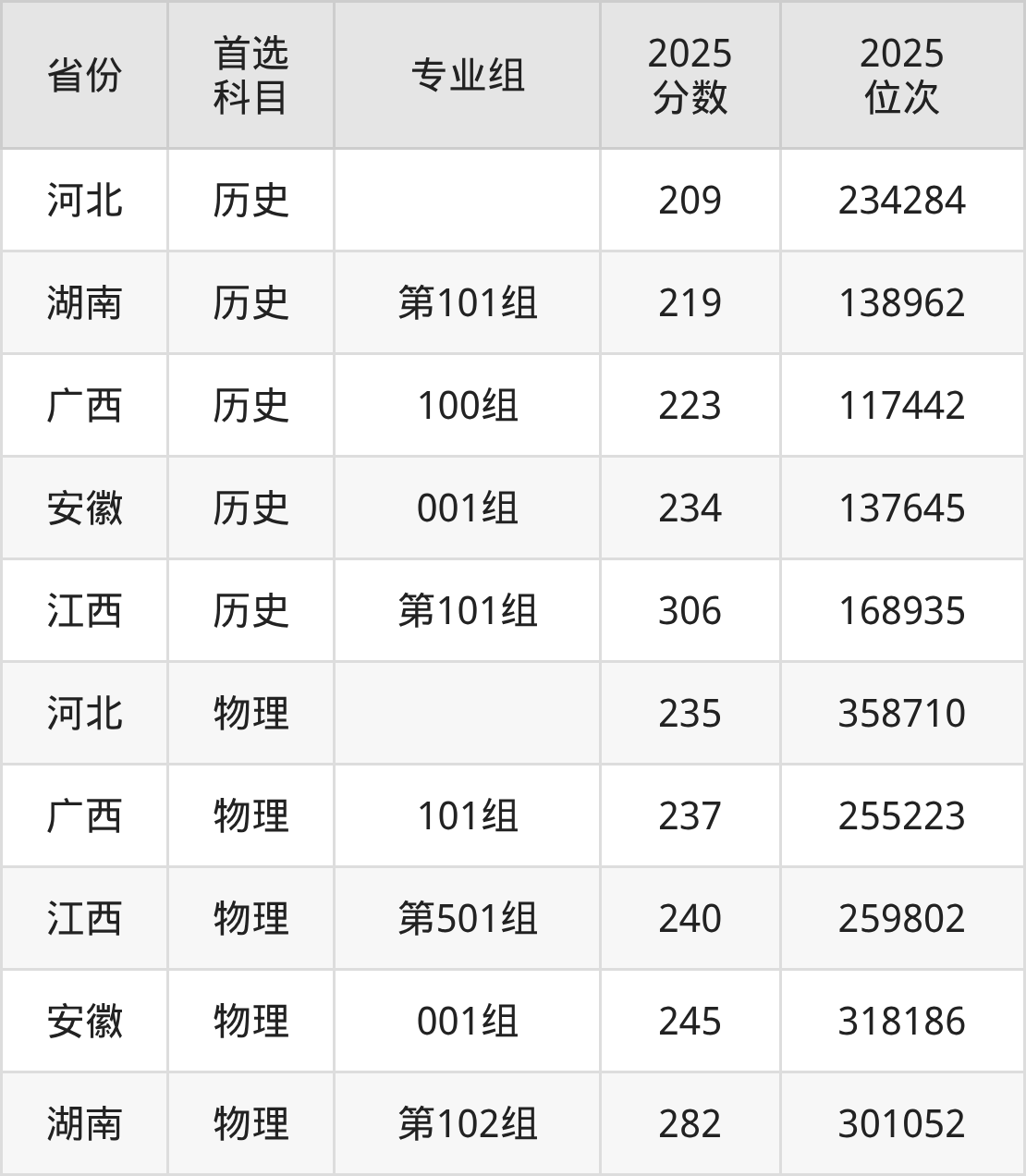 历史类最低分对应地区为河北,录取位次为234284,超专科线9分;最高分对应地区为江西(第101组),录取位次为168935,超专科线16分。