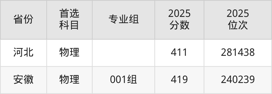 物理类最低分对应地区为江西(第501组),录取位次为259802;最高分对应地区为安徽(001组),录取位次为240239,超专科线219分。