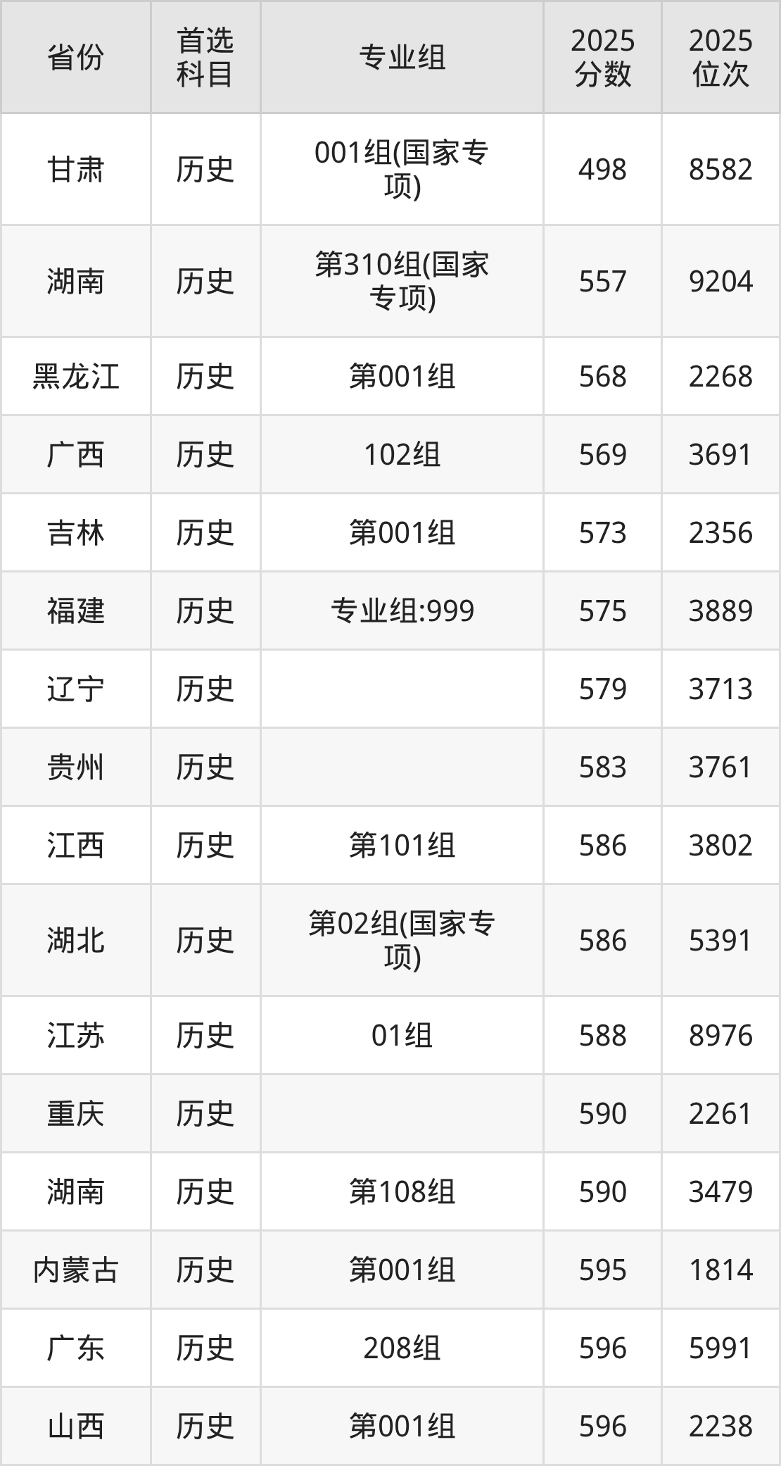 历史类最低分对应地区为甘肃(001组(国家专项)),录取位次为8582,超本科线86分;最高分对应地区为四川(专业组101),录取位次为3048,超本科B143分。