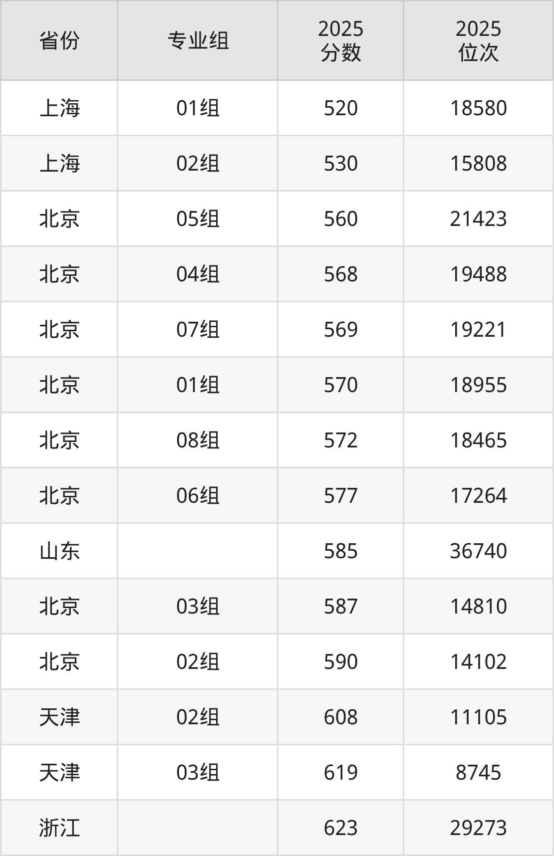 最低分对应地区为上海(01组),录取位次为18580,超本科线118分;最高分对应地区为浙江,录取位次为29273,超一段线133分。