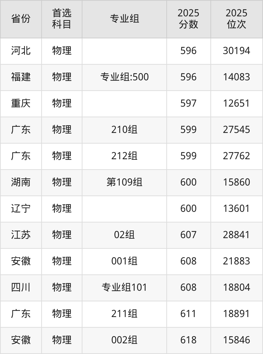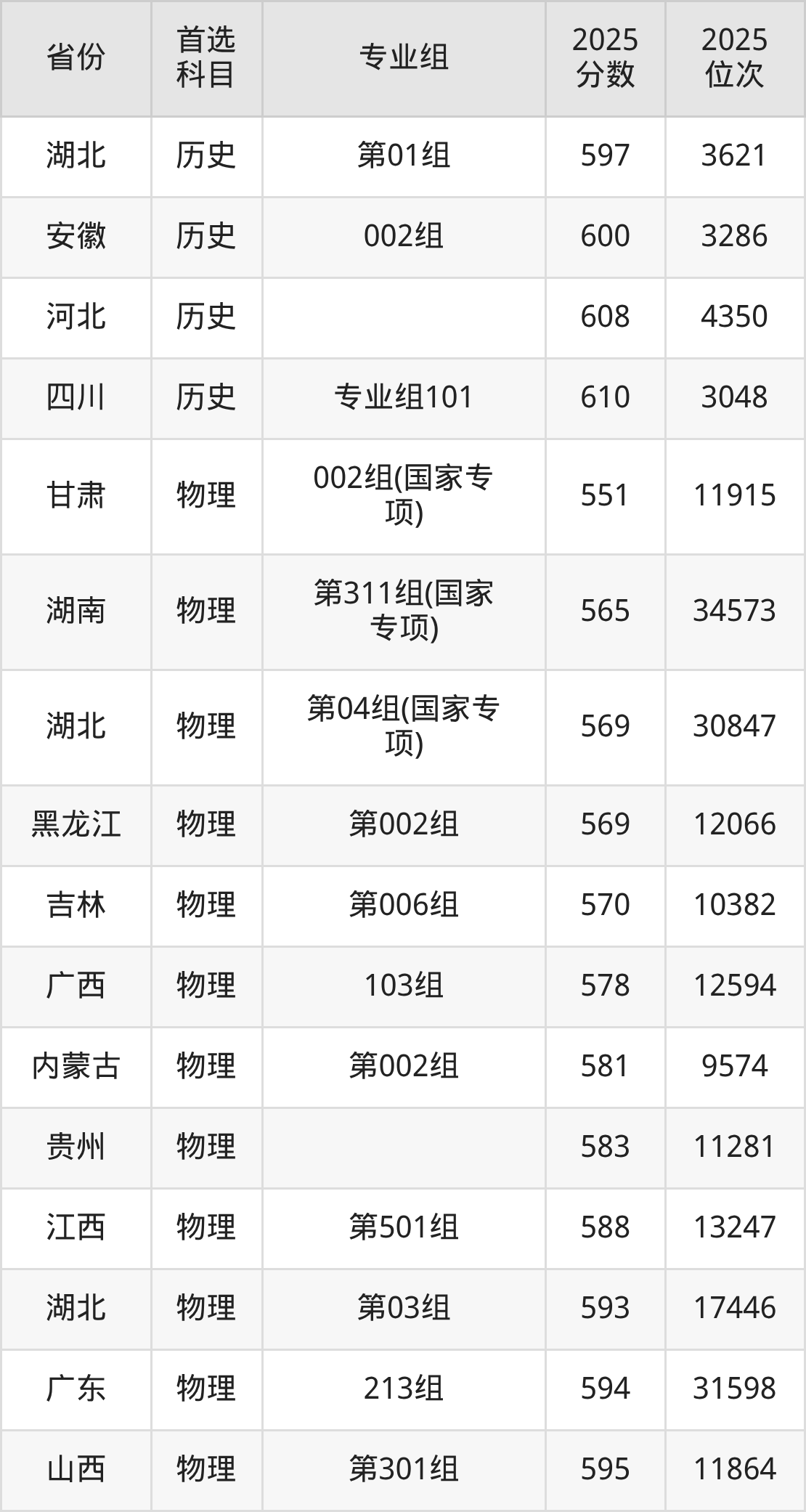 物理类最低分对应地区为甘肃(002组(国家专项)),录取位次为11915,超本科线177分;最高分对应地区为安徽(002组),录取位次为15846,超本科线157分。