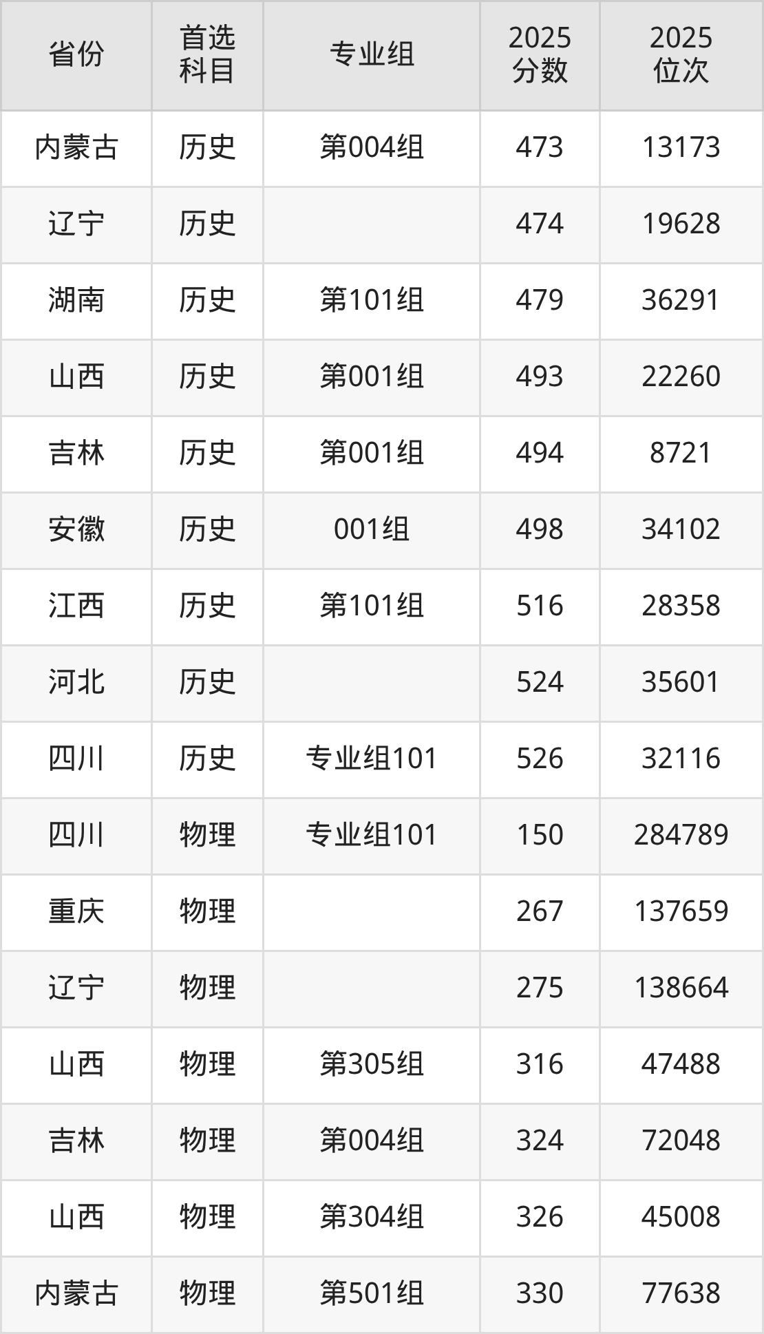 历史类最低分对应地区为山西(第002组),录取位次为28021;最高分对应地区为四川(专业组101),录取位次为32116,超本科B59分。